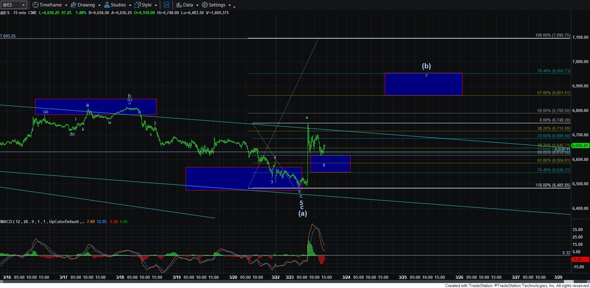 Thus far, the rally seems to be corrective. Moreover, the a-wave within this (b) wave rally spiked just beyond the standard target for an a-wave in a corrective rally, which is the .382 retracement of the (a) wave decline. And, as I noted early in the day that the most likely expectation would be for the market to spend the rest of the day in a corrective b-wave pullback, things seem to be going as planned thus far. And, as you can see from the attached ES chart, we are holding the top of the support box for now.