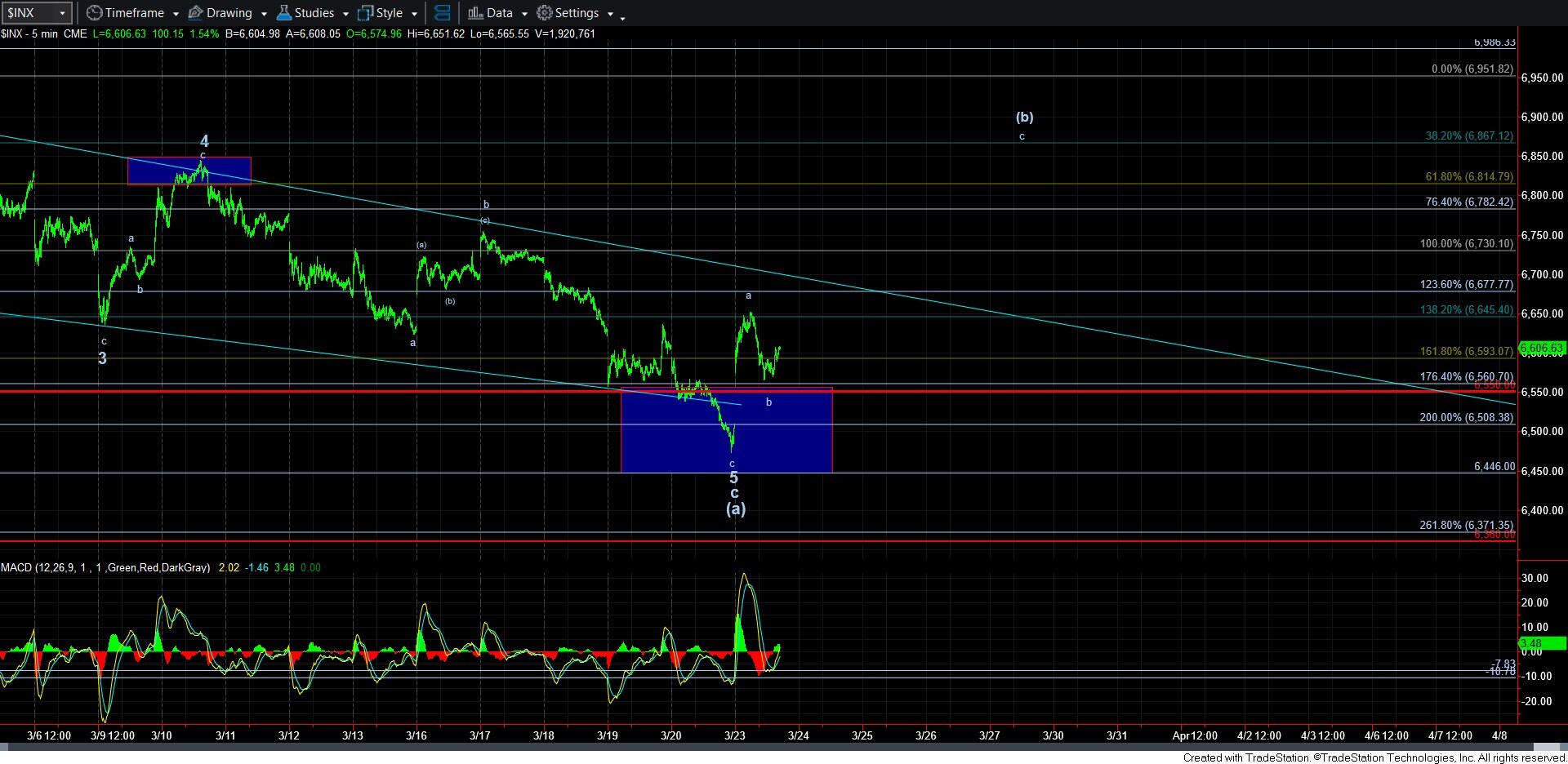 I want to add one more issue. I know I repeat this often, but I don’t think it can be repeated enough. Since we are likely in a (b) wave rally, I need to remind you again that, although I have presented a proposed path for this (b) wave, we know that (b) waves are quite variable in nature, and can take many twists and turns that are not always foreseeable. So, while you see a very simple path on the my chart, this could easily take further twists and turns. For example, the next rally may only achieve the .500 retracement region and then only be a larger a-wave within this (b) wave. And, we can also see many other moves which are not being presented on the chart at this time. But, ultimately, the main focus should be that as long as we hold the blue support box on the 13-minute ES chart, we should look higher for this (b) wave bounce. If we break that support box, then it opens the door to the (a) wave not having completed yet.