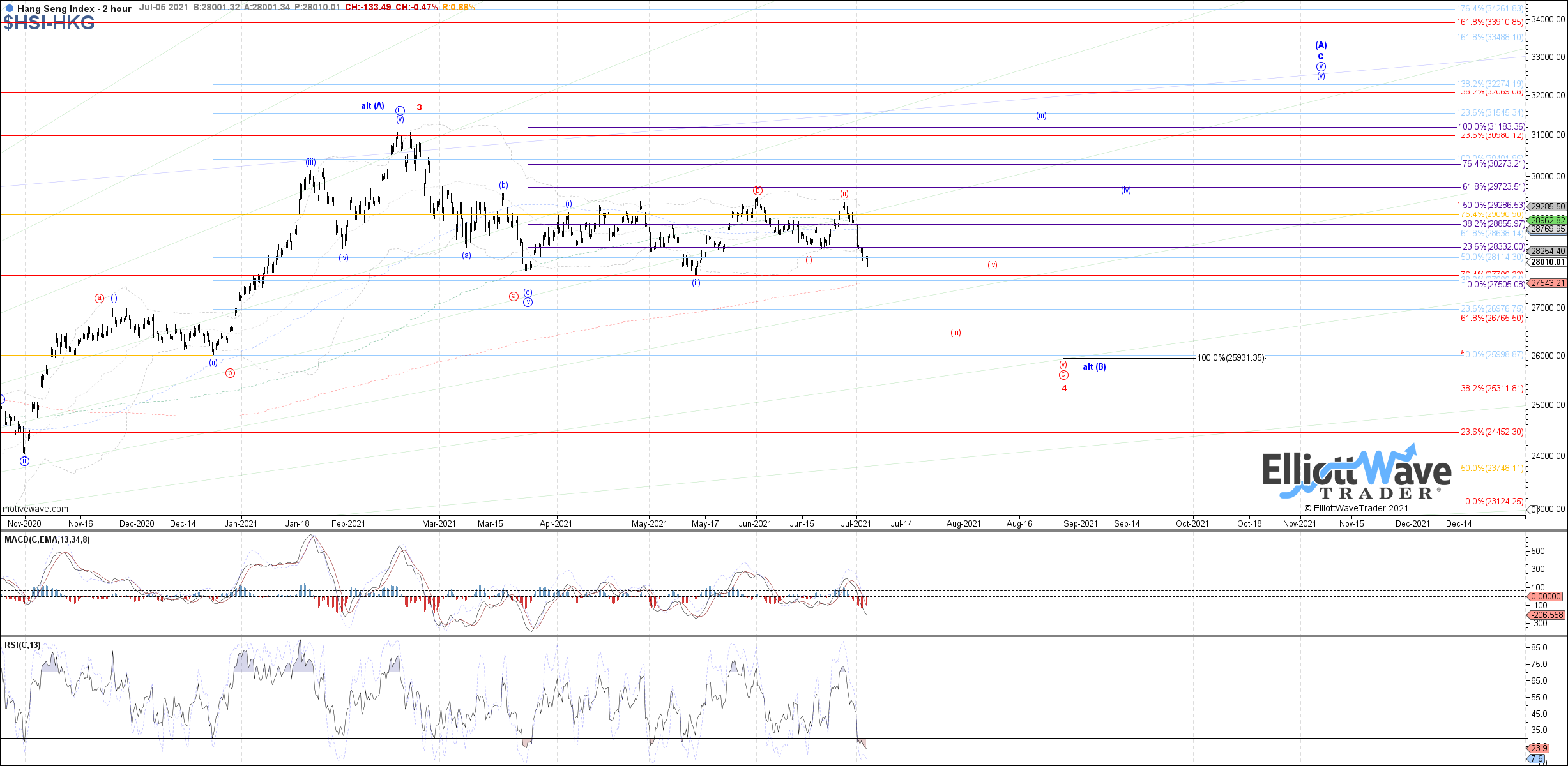 N225: The Nikkei consolidated lower last week, retracing into the target support cited between 28640 – 28315 for blue wave ii of 3. There remains room for a little bit more near-term downside to test the lower end of that support range if needed, and overall the potential i-ii remains valid as long as the June low holds. If price manages to turn back up above 29175, then it should target 29925 – 30450 next as blue wave iii of 3 or red wave c of B.