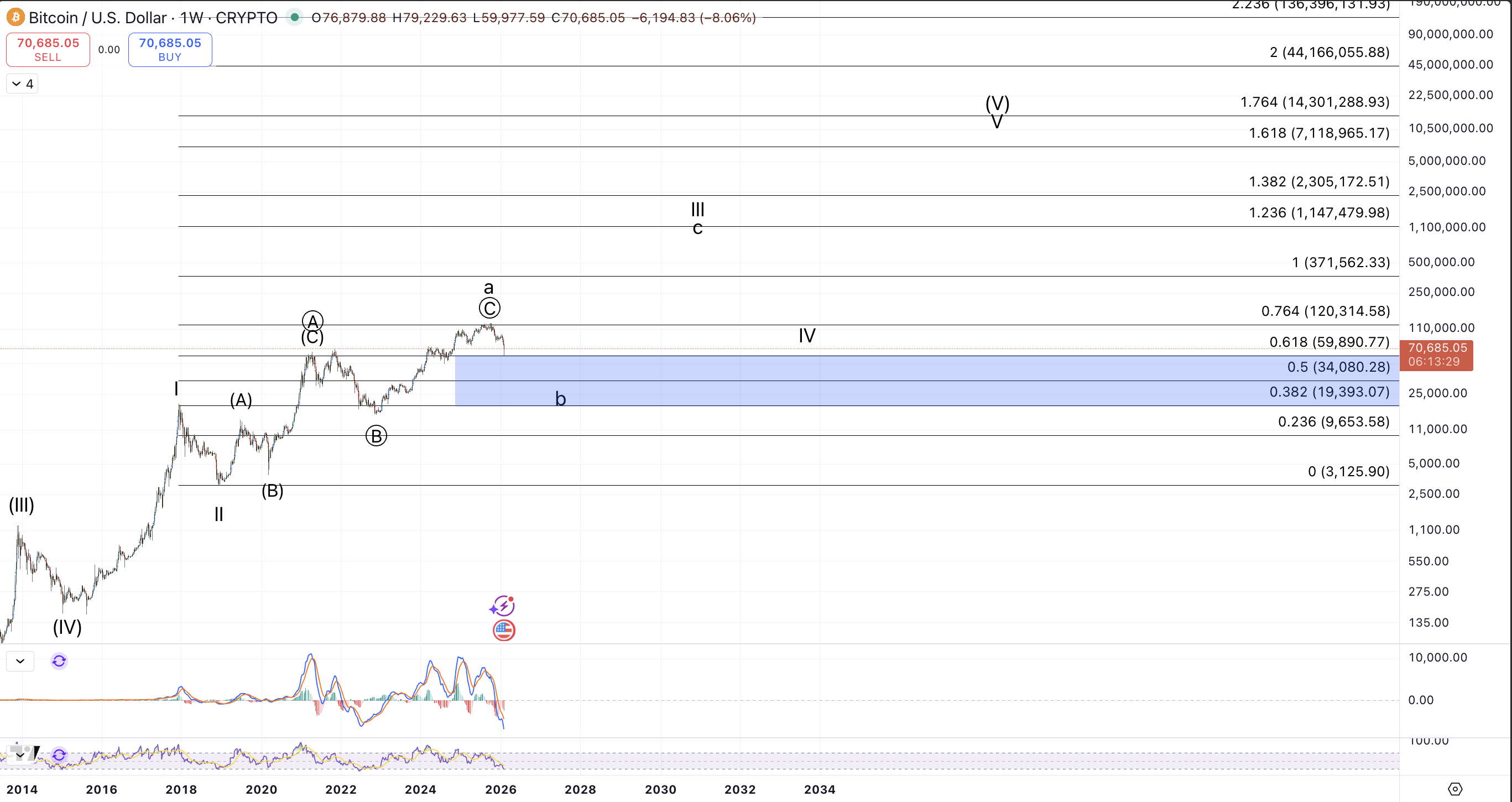 Overall the expectation is for the rest of 2026 to provide corrective action. This first entails a corrective primary B wave bounce that I suspect will retest the January high, $97k~, in a 3 wave rally, as an (A)-(B)-(C). From there, I'll be looking for a big bad Primary C wave down to develop later this year and possibly not until 2027. Expectations for the Primary C entail a drop to the lower half of support for the larger degree Cycle b wave, marked on the Weekly chart, $19k-$34k.