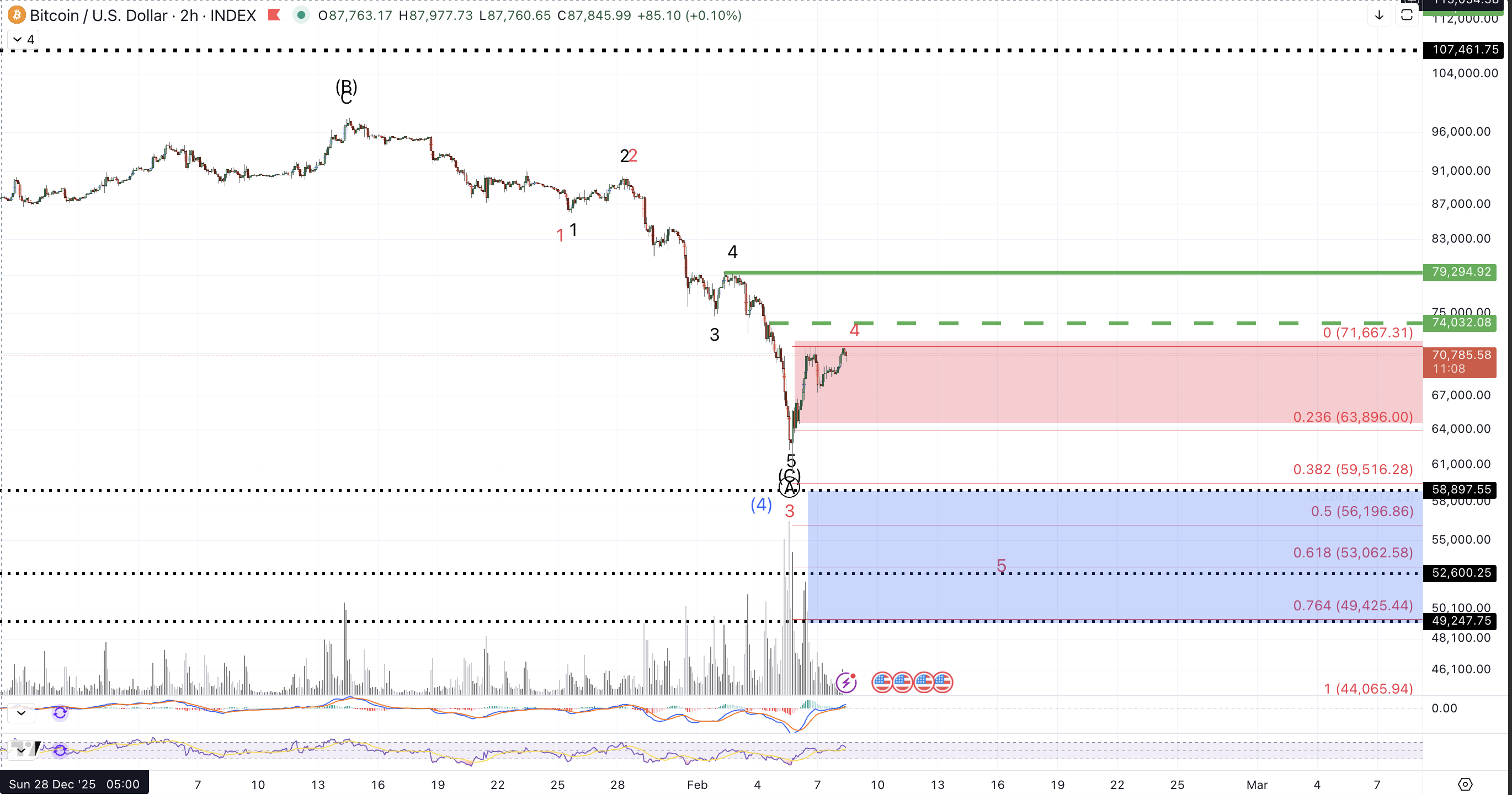 My primary count favors a low in place with a break above lower resistance for immediately lower levels. Also, price has more than satisfied all of the expectations for this drop, ie, a hit of the $67k-$74k region and a possible 5 down from the January high. That said, with such a large final extension down - while characteristic for Bitcoin near major lows - the drop into Thursday's low opens the possibility of considering one more 4-5 lower to complete this (likely initial) decline from the October 2025 high as a reasonable alternative to the immediate bounce thesis. In order to shake-off the specter of a more immediate lower low, I'll want to see price make a sustained break above $74k. Should price fail to exceed $74k, we can see another drop that would very likely target at least $59k but I'd conservatively expect $52.6k to be reached and potentially a retest of the August 2024 low around $49.2k