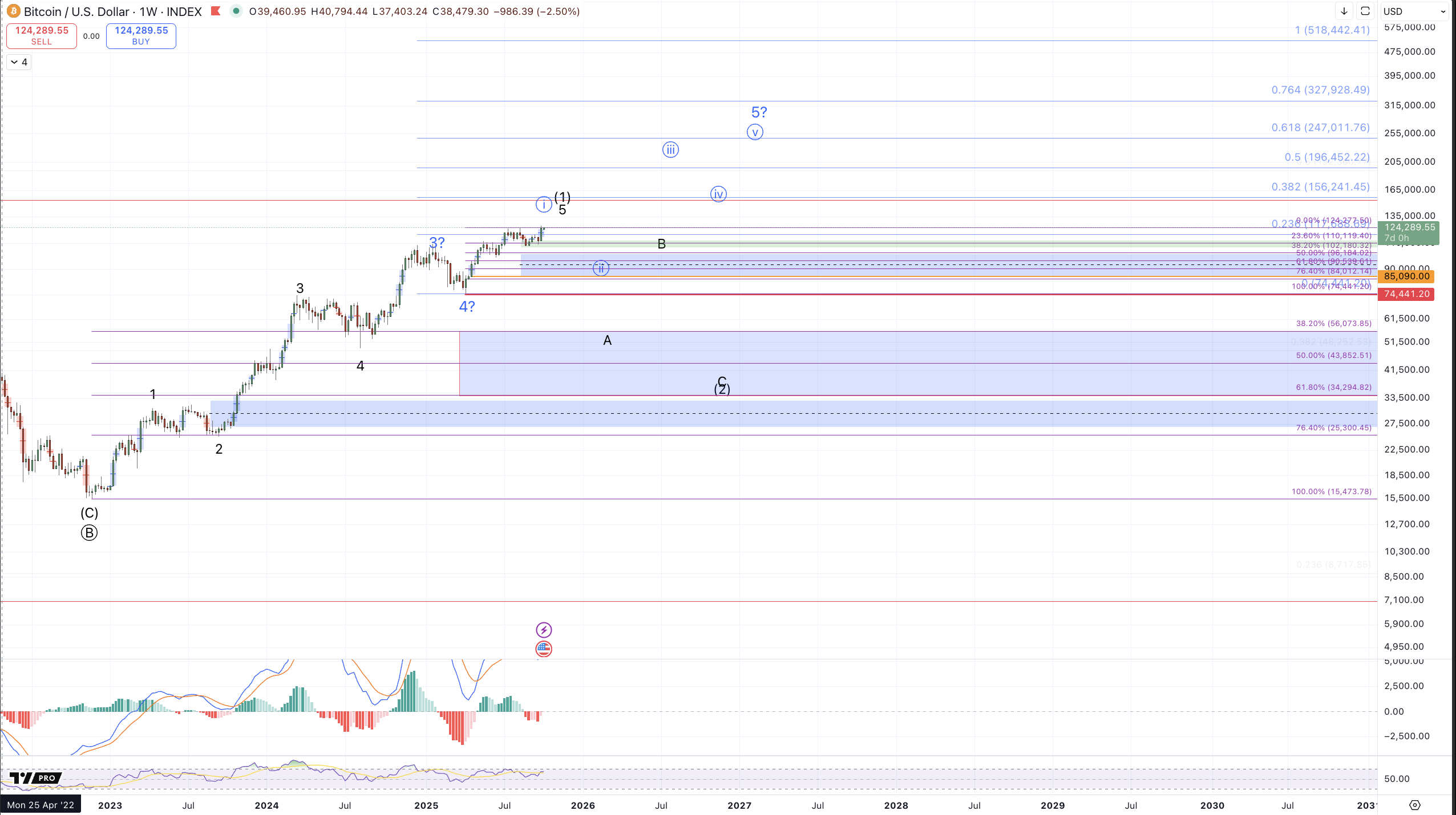For the past several weeks in this series of articles I have expressed a primary thesis that Bitcoin has enough upside to consider the move from the 2022 low complete on all timeframes. Additionally, even though the $125k target we've been tracking since 2022 was not technically reached, the August high only missed it by a few hundred dollars so I was considering it "close enough." As such, my recent bias has favored downside continuation to target the $85k-$100k region before a larger degree path could be determined. ie, would price continue down through the April low, $74k, and retrace the rally from 2022 or would we see another medium timeframe swing higher to push price up to $200k+ as per the blue count.