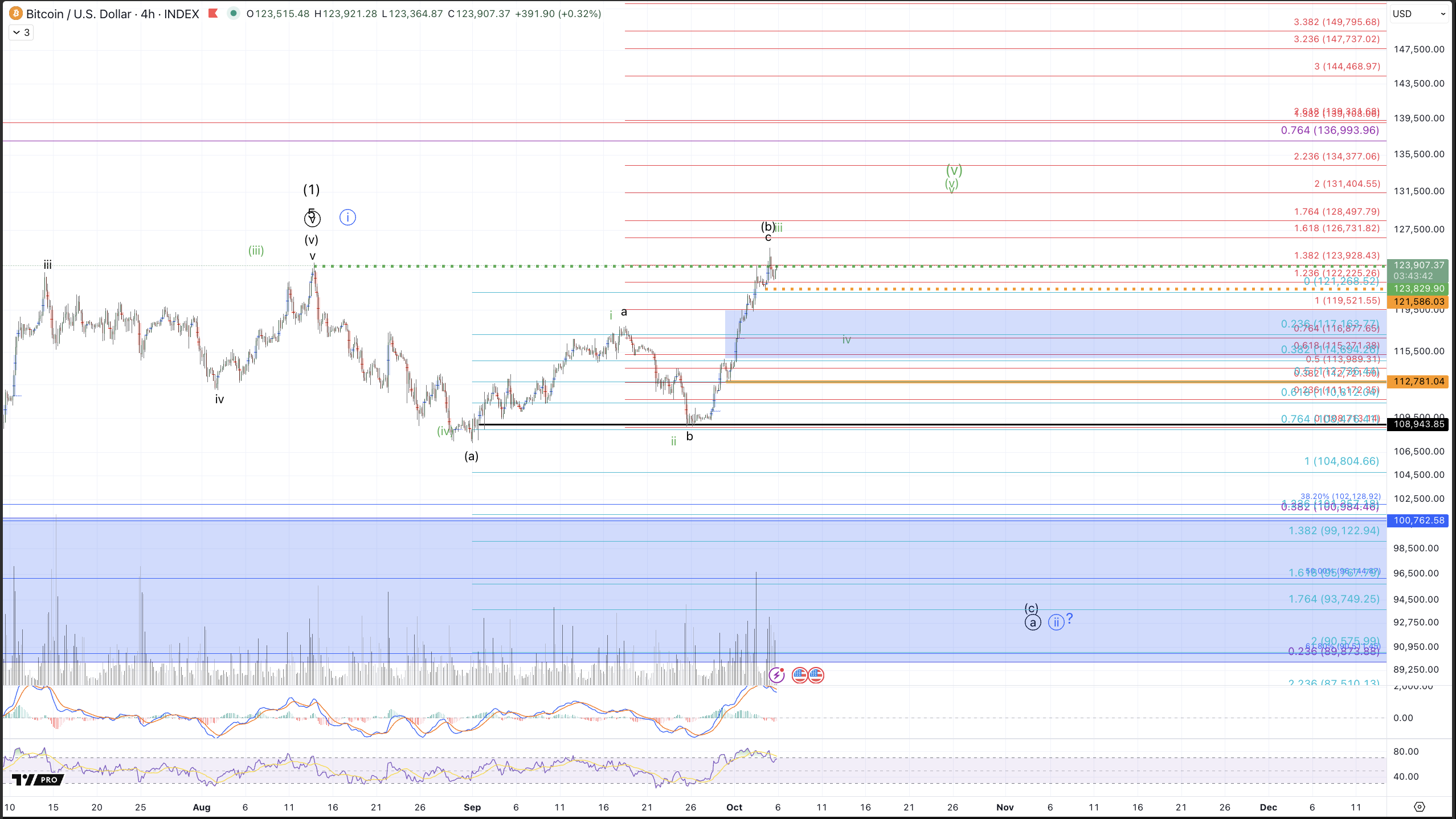 To reasonably establish that some kind of pullback is underway, we'll need to see a sustained break below $121.5k at which point our attention turns to the $114.6-$119.5k region in which we have Fibonacci support for a wave iv pullback and breakout / fair value gap area from this past week. Should this region hold, we can reasonably expect another rally up to target minimally $128k but I would not rule out much greater extensions in the current environment, even as high as $156k.