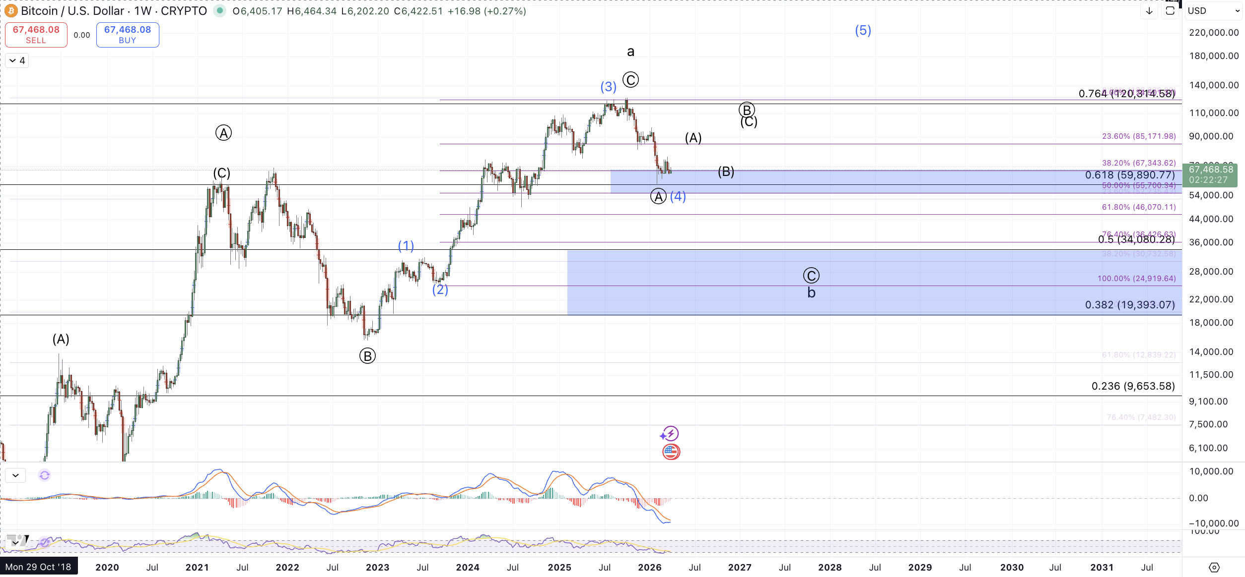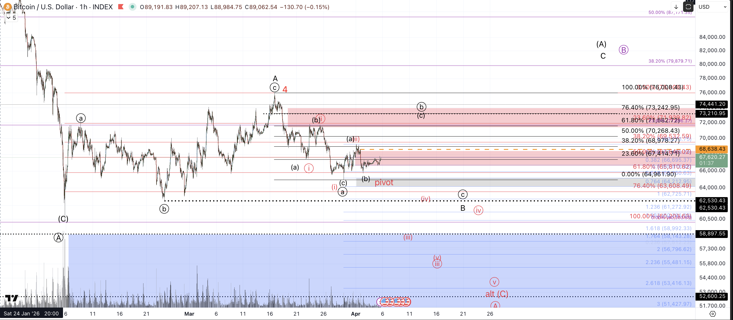 In these persistent three wave patterns, I can not convey any particular path as a high confidence outcome. That is to say, I'm seeing the market as mostly lacking conviction for sustained momentum. That should be apparent when considering the expected path displayed in black on the 1 hour chart: up to $71.5k-$73.3k zone >>> down to $62.5k-$63k>>>up to $80k+. So I'll note explicitly that I don't have a ton of conviction on which direction the "knuckleball" will oscillate next.