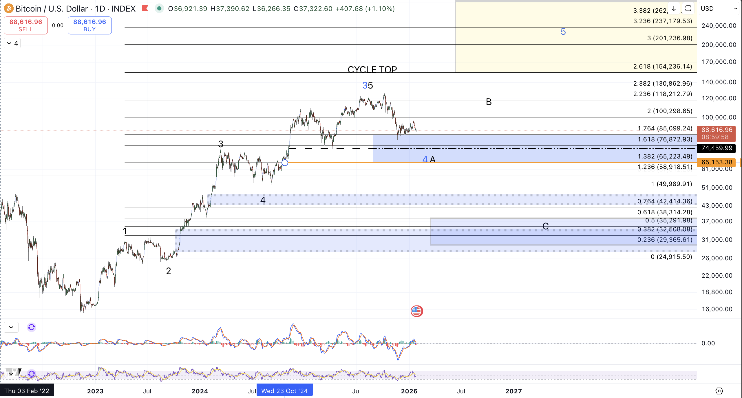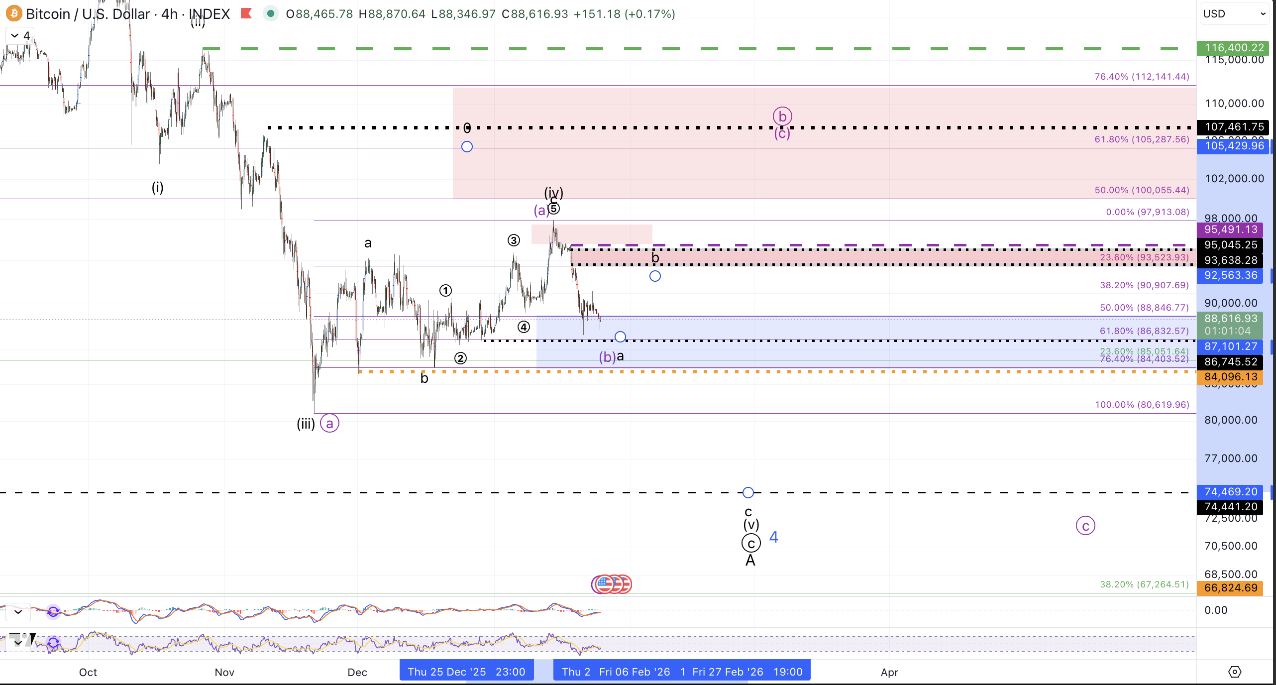 As discussed last week: "if price makes a sustained break below $89k, a more immediate move down to retest the April 2025 low ($74k) and likely lower will become preferred. For the purple count to become operative, price should form a corrective decline and make a brief break below $89k followed by a quick recovery."