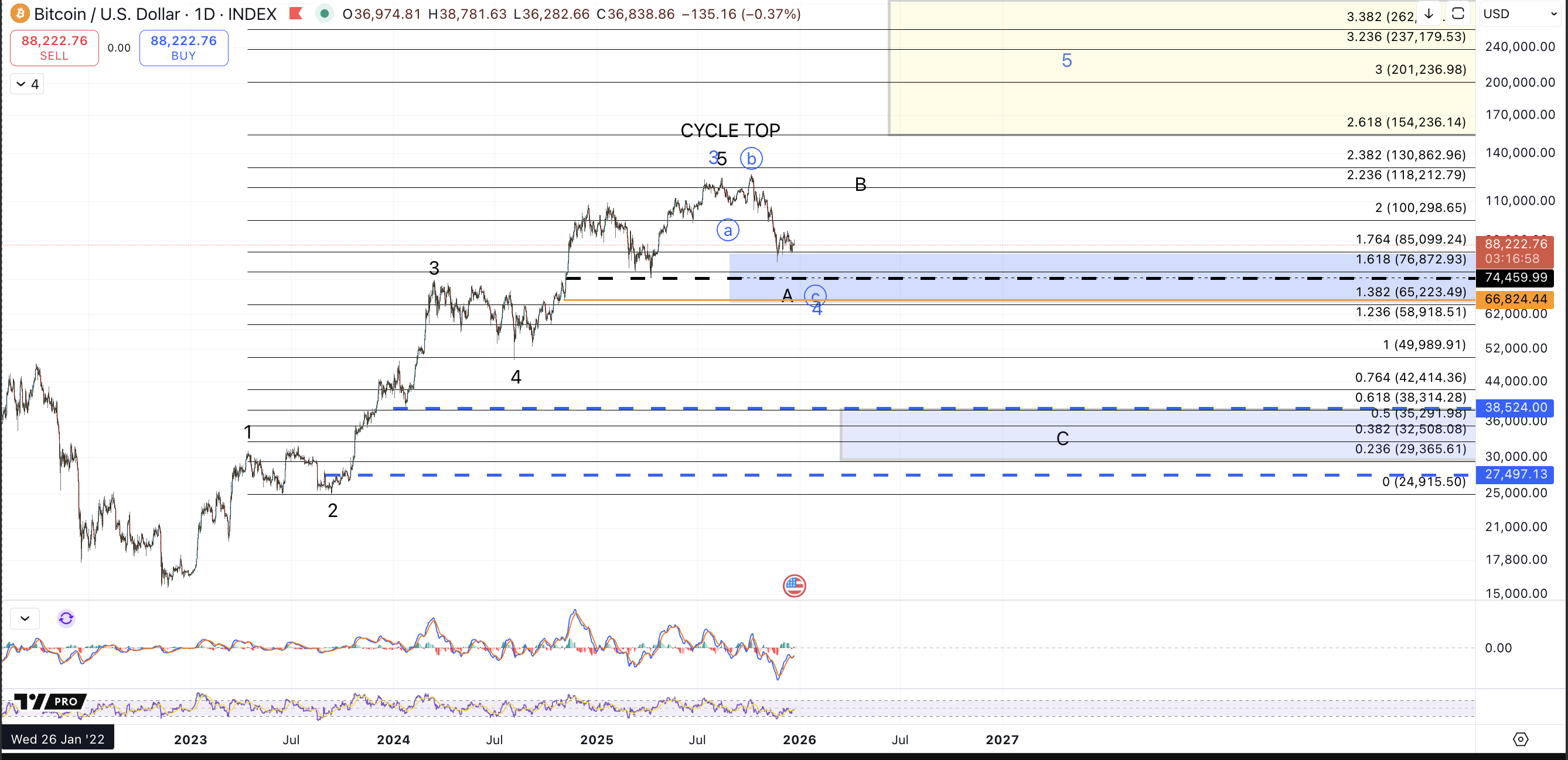 The larger degree perspective still favors a significant cycle top in place with the reasonable alternative shown in blue for a bigger 5th wave to develop in 2026 but ideally after a final lower low into the $67k-$74k
