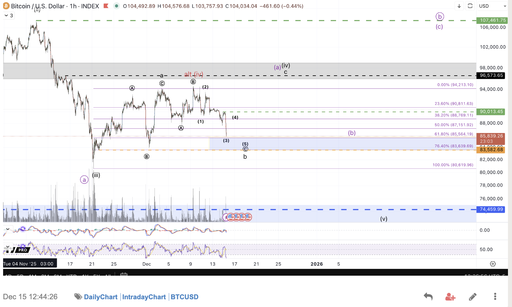 The most immediately bearish count entails a top in place for wave (iv) as shown in red and price working on the fifth wave down targeting $67k-$74k. From a zoomed out perspective, this path is the tidiest for a typical look of a C wave. However the micro degree shows a subwave path that appears rather incomplete into the December high and so this path still appears unreliable until some support breaks on the micro level within the larger trading range. In the current stance this entails minimally a sustained break back below $85k to challenge the micro bullish setup.