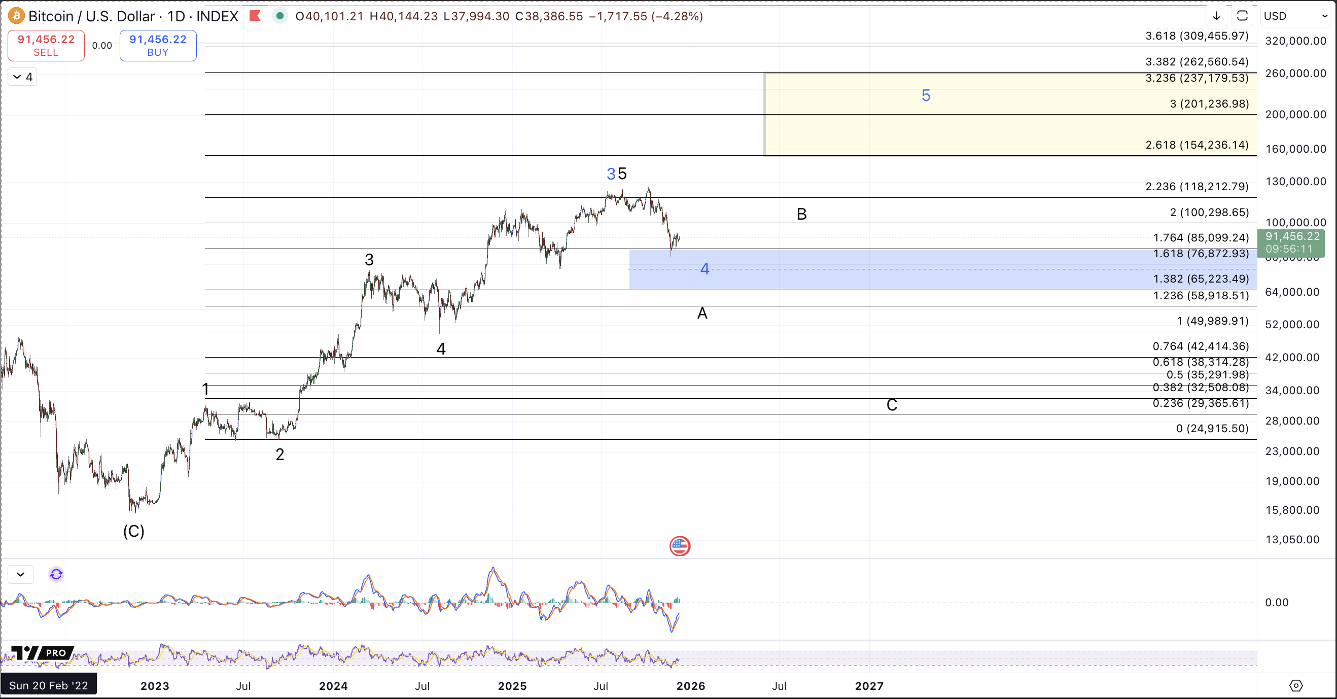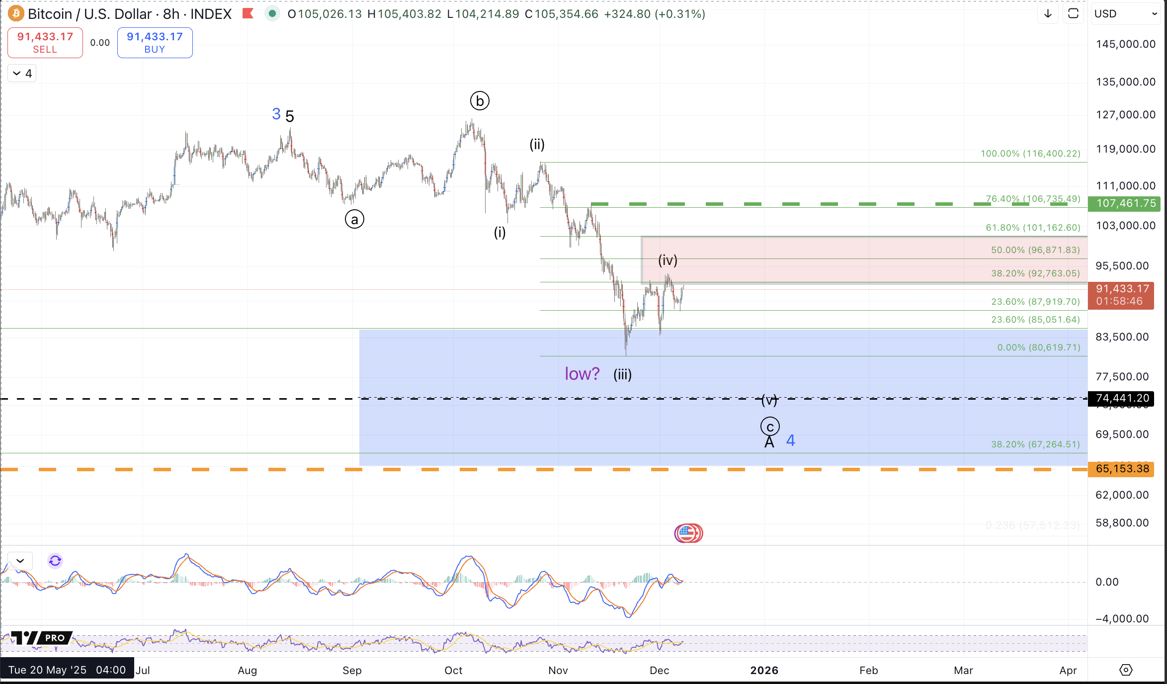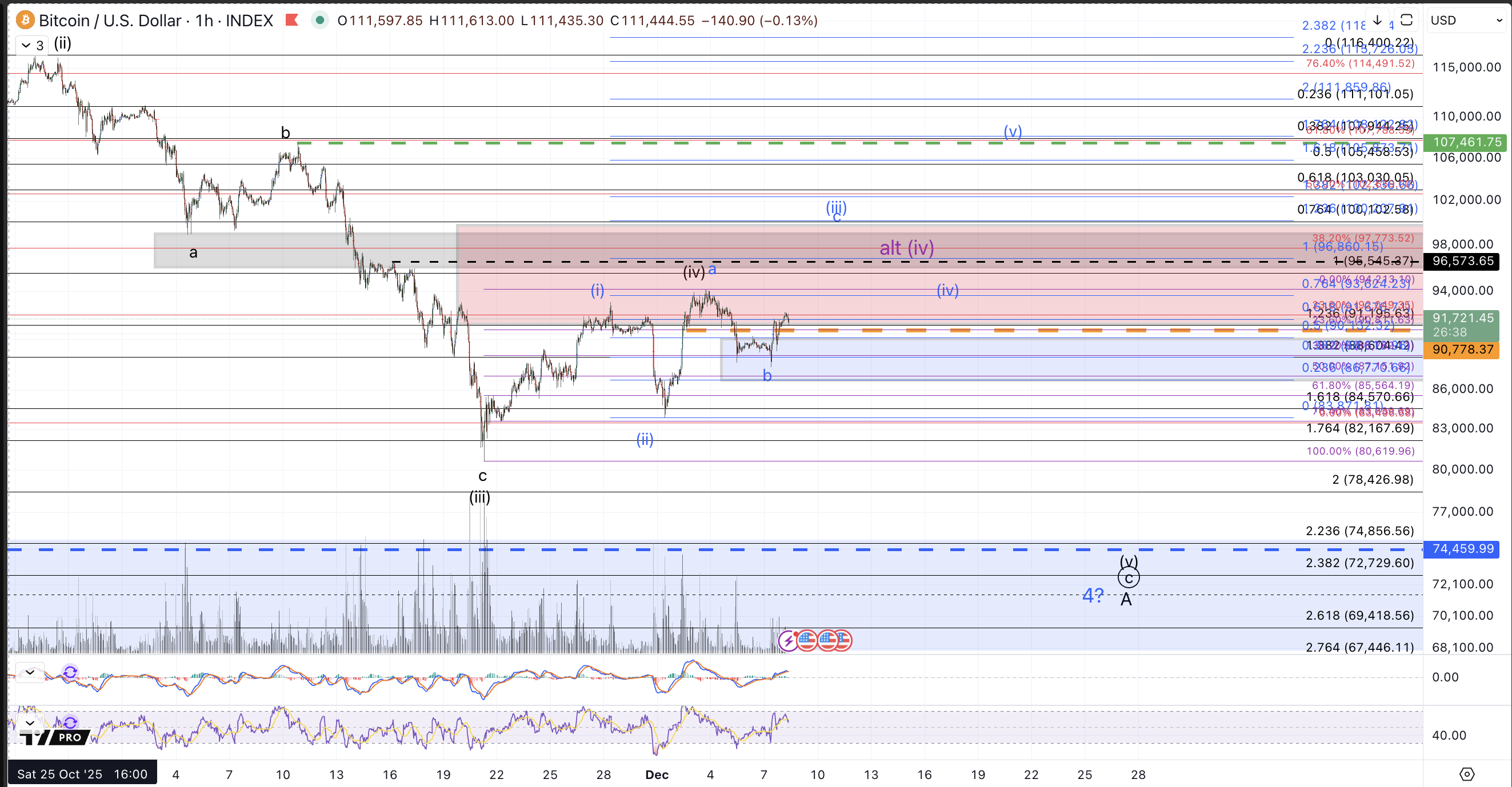Upon writing last week's article, price had established a bottom of sorts at the November 21st low around $80.6k. The bounce up to $91.7k last weekend was sufficient for all of a wave (iv) into standard resistance which portends a wave (v) down to come.