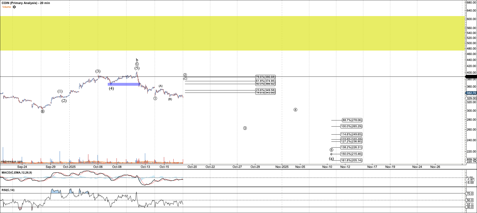 I am now looking for COIN to hover in this region after completing what looks like five waves down off $402. After the first wave down, we should see a corrective pullback up that ideally stays under $386. That rally is marked as circle-2 on my chart below. If that level holds, the next move should be a strong decline in wave C, targeting between $265 and $225.