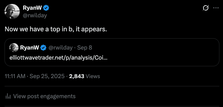 Further, in between writing that previous article and this one, I tweeted on September 25 that it appeared COIN had topped. At the time, I took on a position in put options, which profit from downward prices, and bought shares to hedge the position and scalp any upside. You can see that tweet here. It took roughly seven days for the market to prove me wrong — a reminder of how difficult hunting for a B-wave top can be.