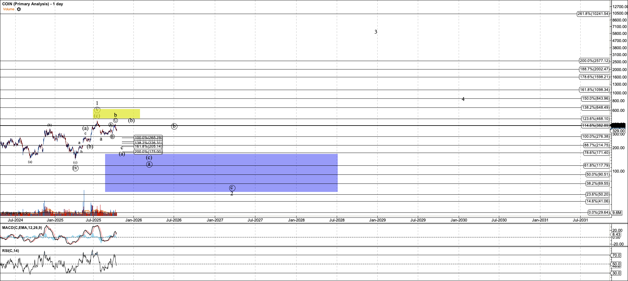 Since my original review, COIN has pushed nearly to an all-time high — to $402 versus its highest print of $444.65. It is not uncommon for B waves to briefly breach all-time highs before a C wave takes hold, sinking price back into earlier ranges and continuing the correction. However, this B wave pushed to the limit of what I expected, making a fresh read of the structure warranted.
