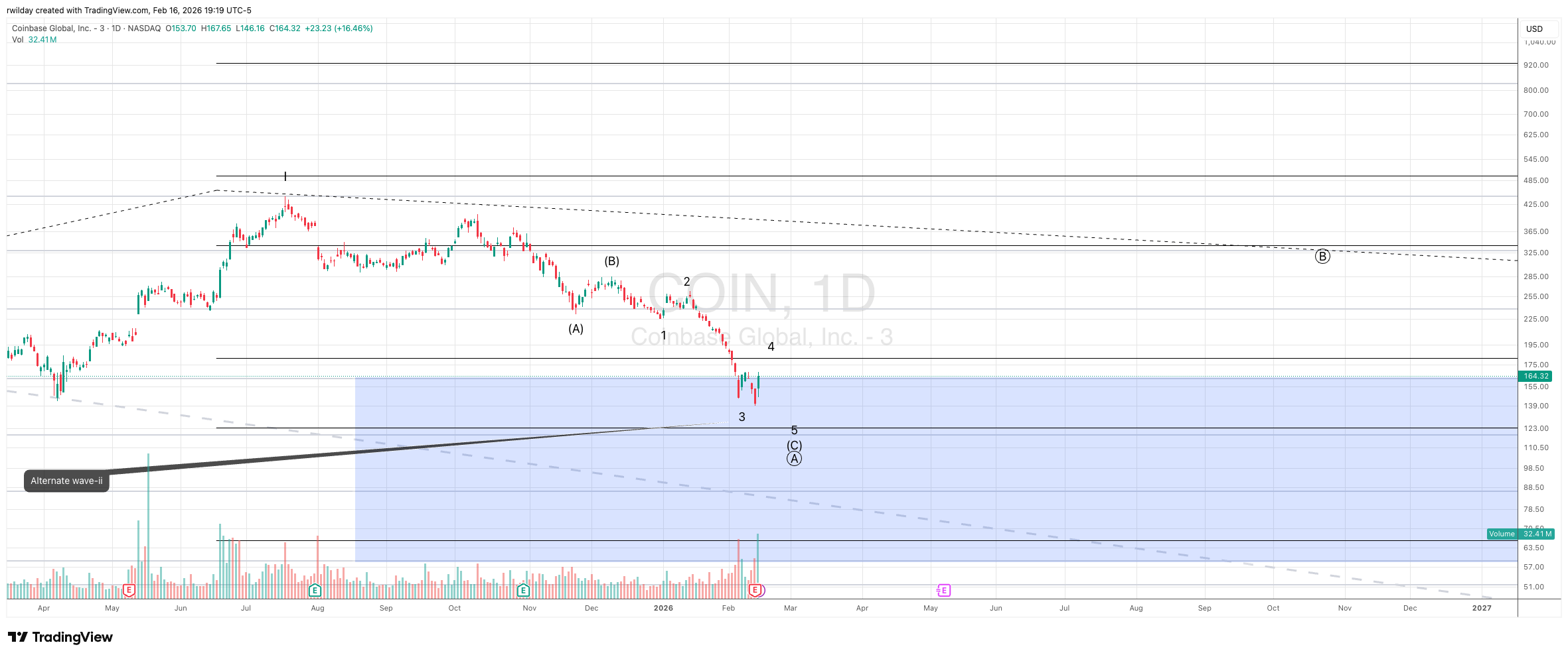 Regardless, COIN appears due for a sizeable rally. Even if that rally is only a B wave, my primary view, it should reach at least $205 and more likely $236–274. Occasionally, the B wave of wave twos exceeds wave one. A move toward $590 is not impossible in that context. However, the structure would likely be corrective, setting up a potential trap before another bear-market leg lower.