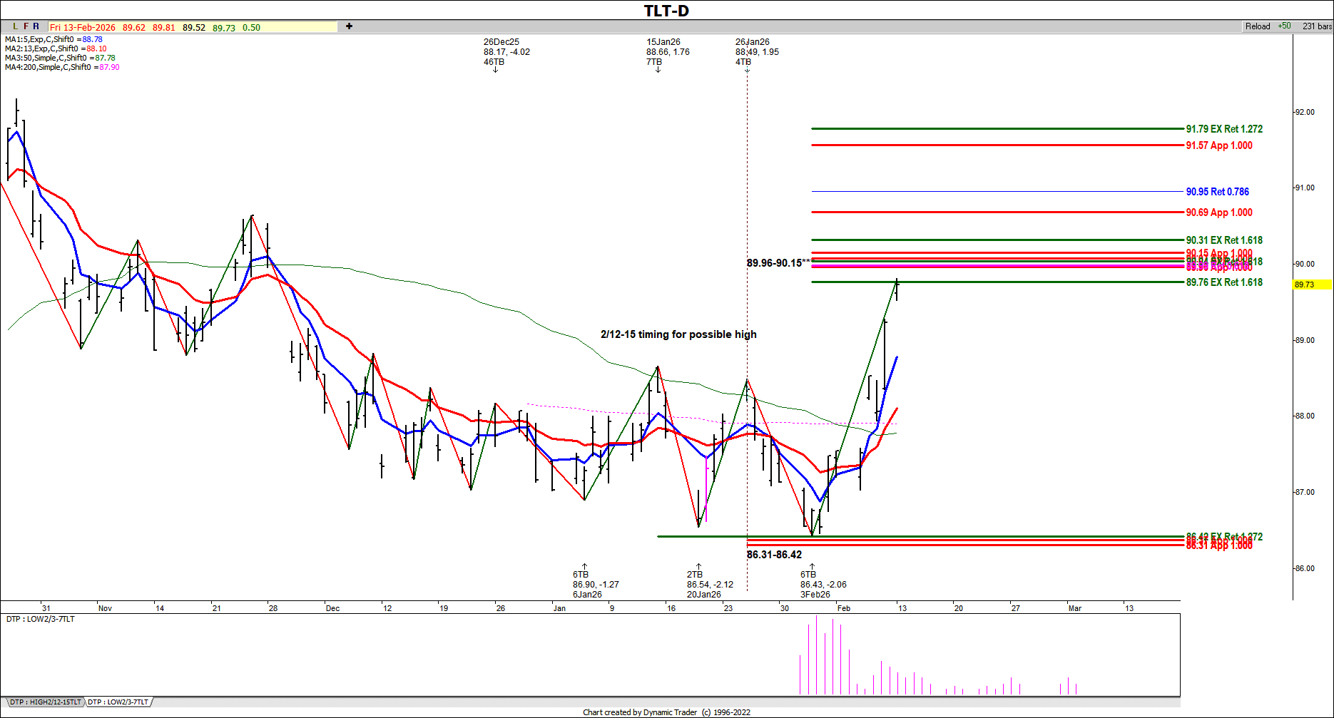 We actually had a relatively wide timing zone between 2/3-2/7, but the first standout bars in our timing histogram came in 2/3 - 2/4. Our price support cluster came in between 86.31-86.42 which included two symmetry projections and a 1.272 price extension. The actual low was made on 2/3 at 86.43 which was within a penny of the zone.