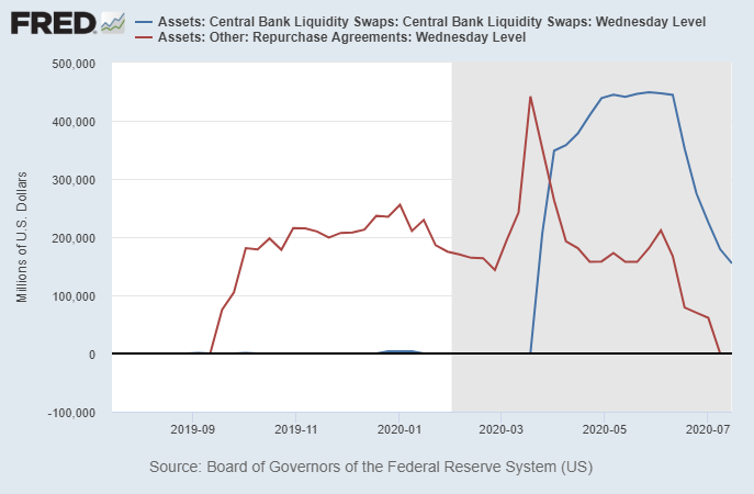 Since the repo rate spike in September 2019, the Fed has had an open line for repurchase agreements. Two weeks ago, that went down to zero for the first time since September 2019. And the Fed’s liquidity swaps with foreign central banks, which peaked in May, have been substantially reduced by about 2/3rds as well. Here’s a chart of repo loans (red line) and central bank liquidity swaps (blue line); the combined portion of the Fed’s balance sheet that has notably gone down over the past month. That’s good news: