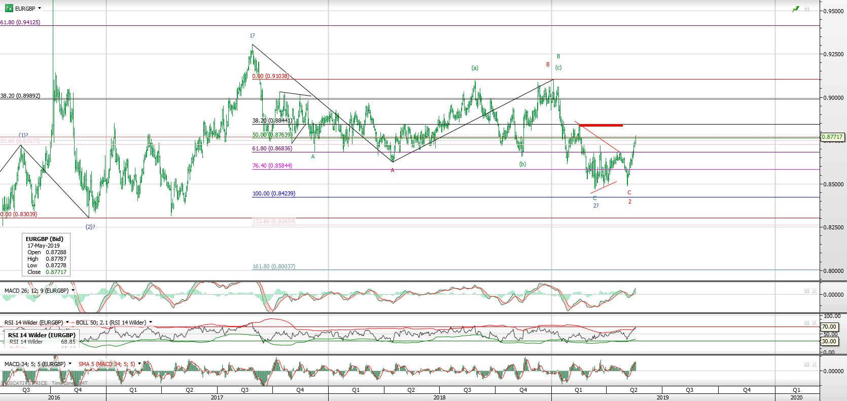 EURGBP: the red count is modified - new count has the pair in wave 1 of iii up and 0.87885 is the resistance where pullback is expected to start.