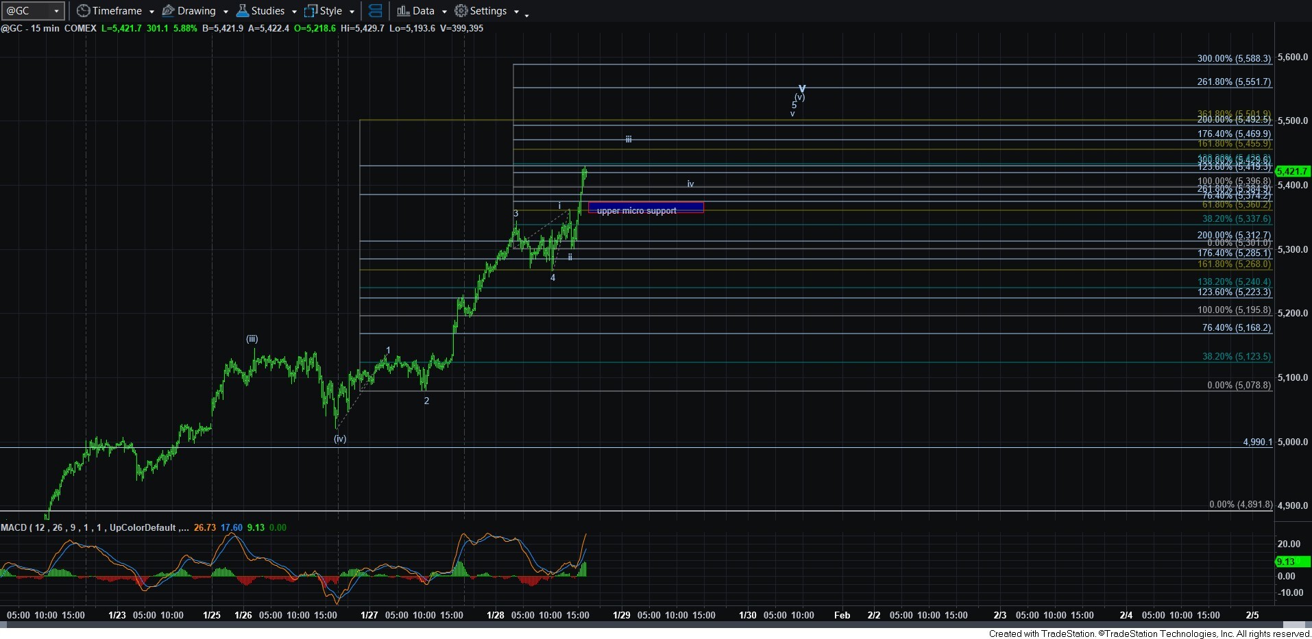 With regard to the wave structure in gold, I am seeing this as a very extended wave v of the c-wave of within the 5th wave of the ending diagonal, which you can see on the 60-minute chart. If you want to zoom in a bit more, I have added detail to the count in wave v, which suggests that we are completing that structure as well. Moreover, you can see that I have noted a micro support level, which has a bottom in the 5360 region. (PLEASE TAKE NOTE THAT THIS IS NOW BASED UPON THE APRIL CONTRACT). As long as we remain over that support, I think we still have higher to go to complete waves iii, iv and v. But once that support is broken, we have the catalyst for a potentially strong reversal as it could signal the end of this parabola.