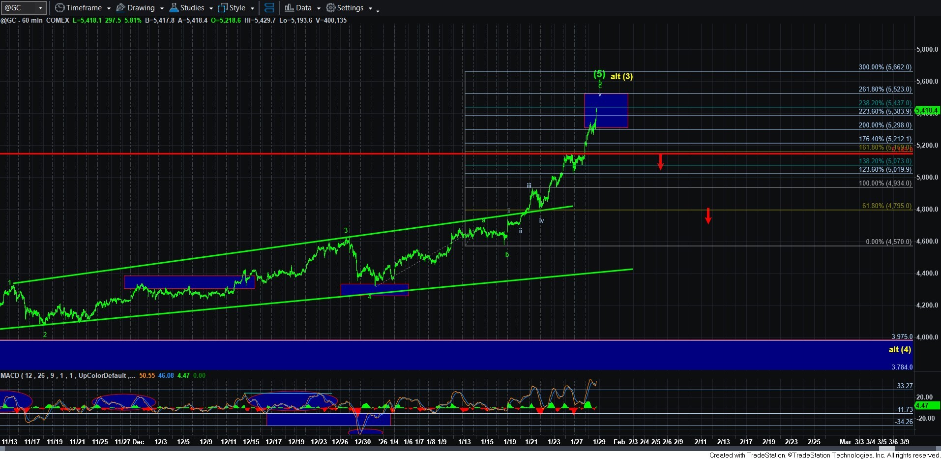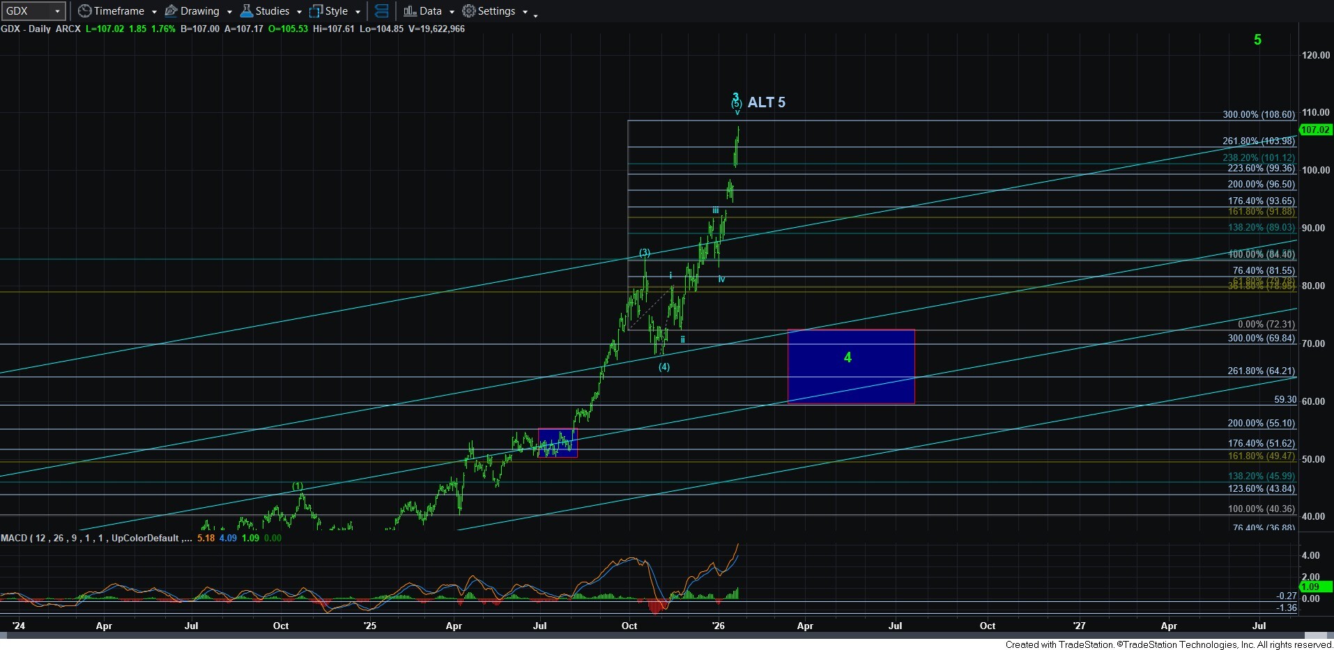 As far as silver is concerned, there is some potential that it has already completed its parabola, as it is struggling to make higher highs. Moreover, the structure is overlapping during this segment of the rally, which does lend to that potential. But, it is entirely possible that it is tracing out an ending diagonal to a higher high while gold completes its structure. I would not get in its way in either case right now.