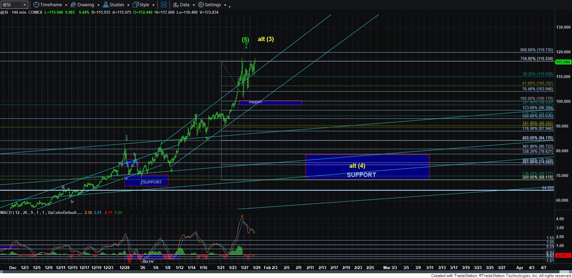 Support for silver is the 98.50-100 region, which when broken, will likely suggest that this upside is done, and a very large correction will likely ensue. Again, it could mark the conclusion of this entire rally, but I cannot yet make that determination. But, the potential of that is quite high at this point.