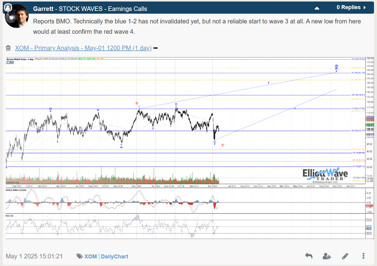 Some mixed signals in terms of underlying prices for energy. With that in mind, how does Exxon-Mobil look from a technical/ Elliott Wave perspective headed into earnings?