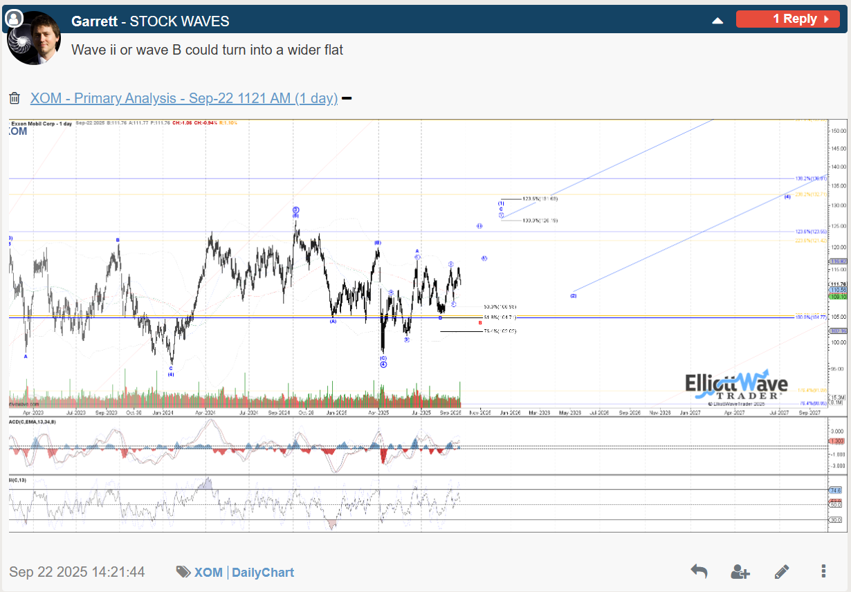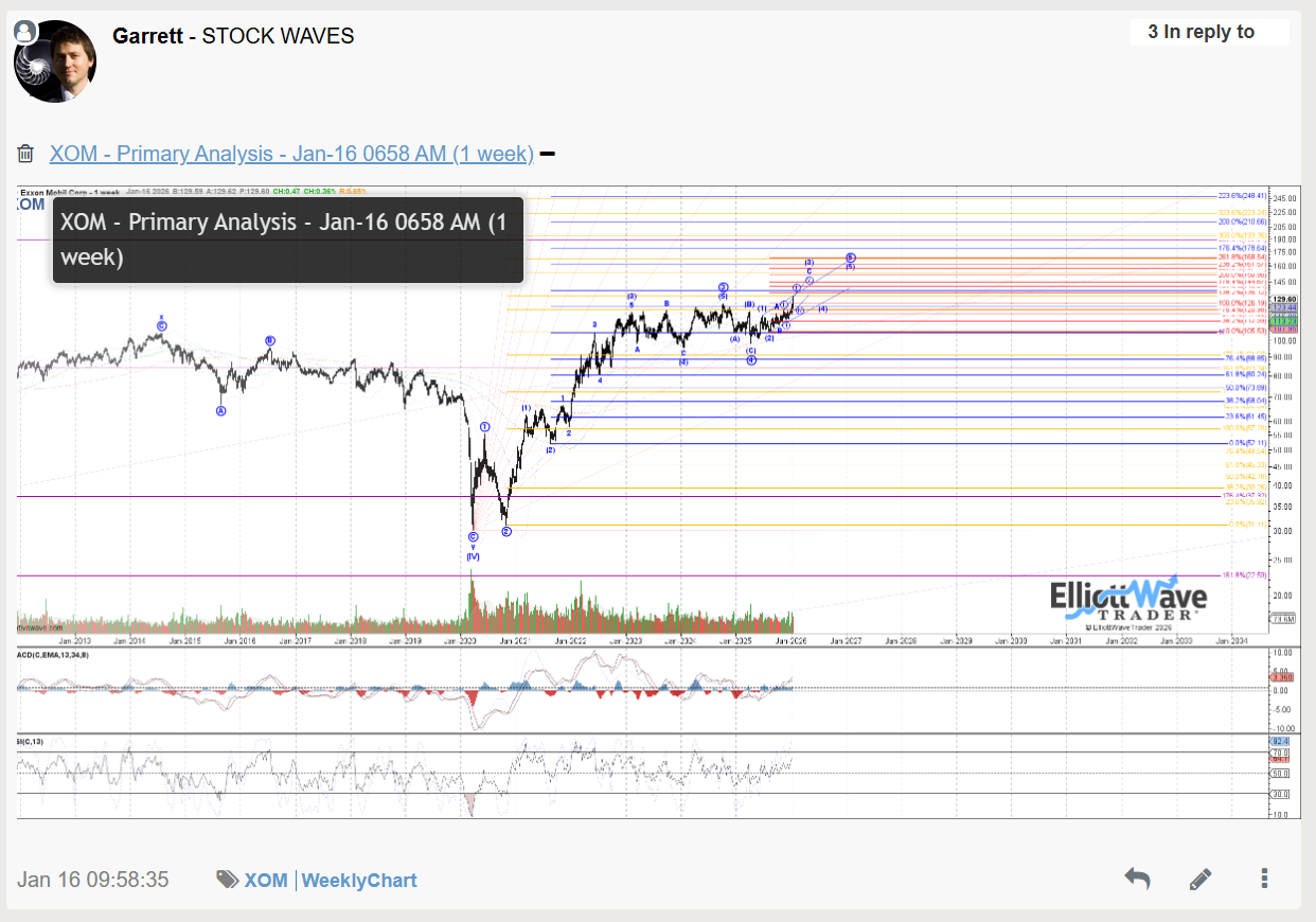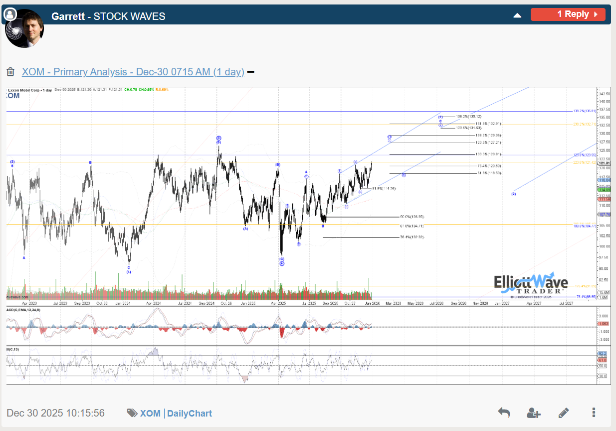 Stock Waves at Elliott Wave Trader has covered Exxon-Mobil (XOM) since it started back in 2012, but the current pattern has been tracked since the 2020 lows and more recently tracking the April 2025 low for the final leg up from the 2020 low.