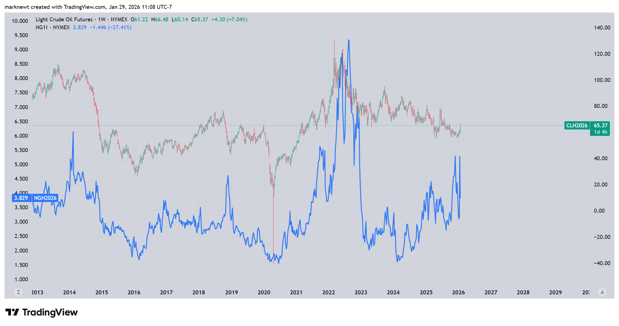 Weekly chart for Crude Oil futures(right scale) and Natural gas (left scale - blue) futures