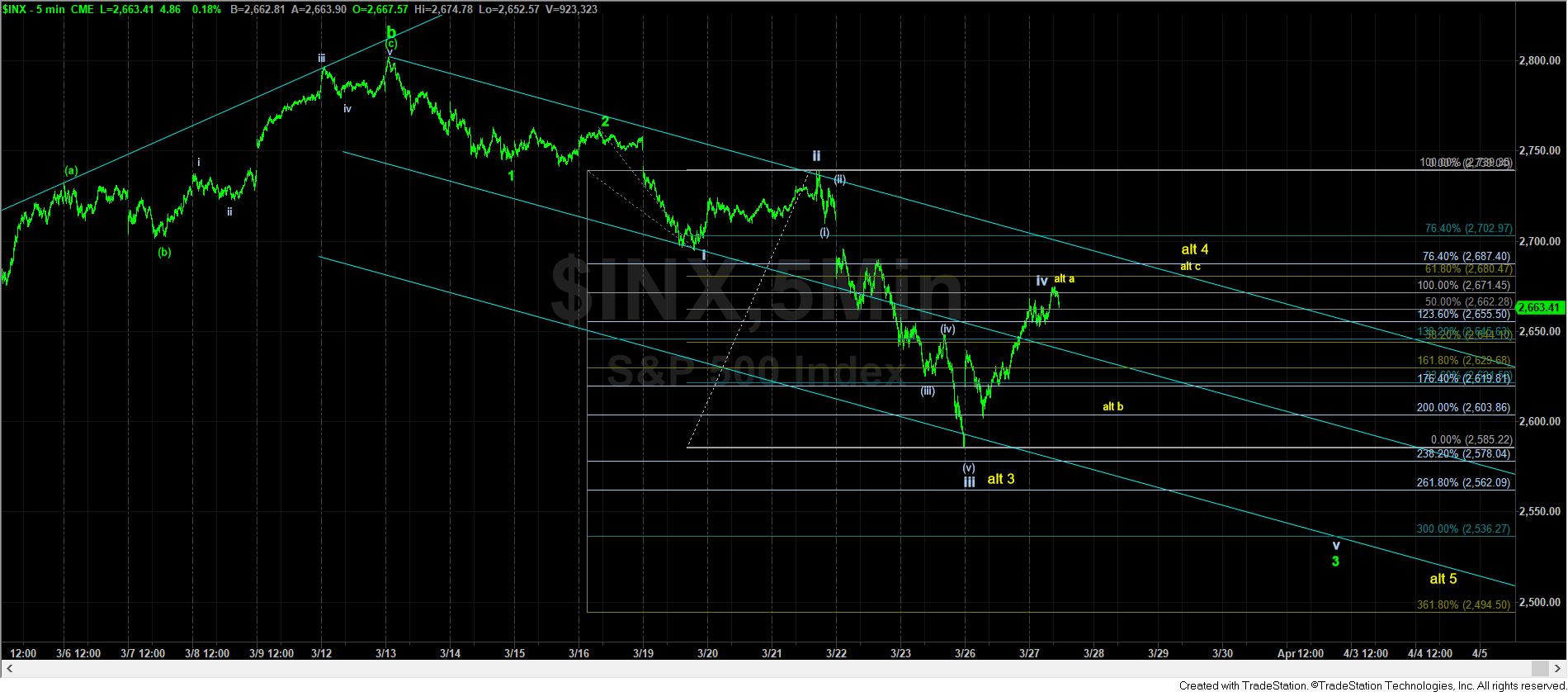 While SPX has come up a bit higher than I had initially wanted to see from this past weekend, we really only have what counts best as 3 waves up in ES and SPX at this time. So, if we can break 2650, it can open us up to a move back down to the 2600 region in the yellow count, or a direct drop to the 2530SPX region in the impulsive count.