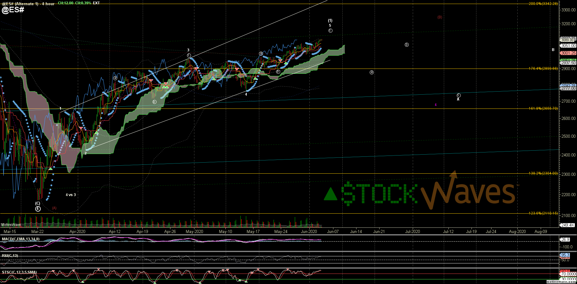 Looking at the smaller degrees though for both SPX & ES (Micro & Nano tabs), the c of 5 should really get at least a (iv)-(v) higher, and ideally in the ES we get another micro 4-5 to complete the (iii) a little higher first. 3060-3040 is key support for any reasonable expectations higher, but if that holds the (v)th of c of 5 in ES can still reach for 3160.