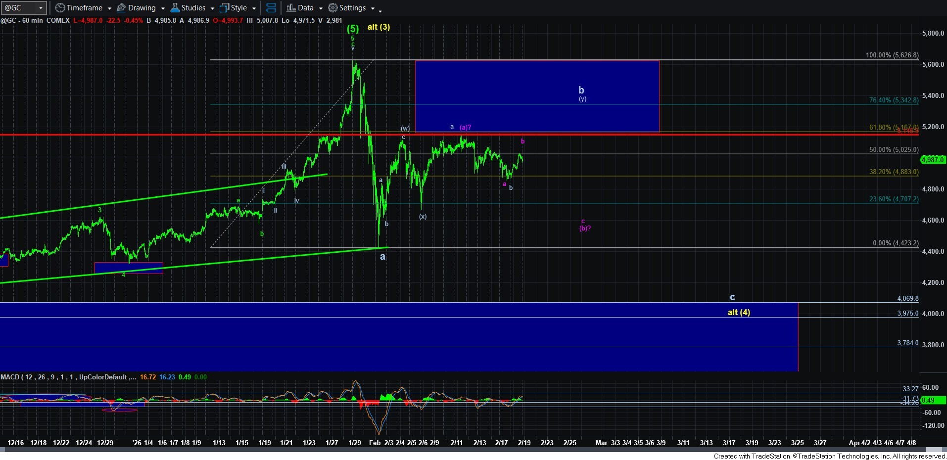 But, that is not what we have seen. Rather, the decline is clearly 3-wave structures, which leaves the door wide open that the (b) wave of the b-wave may not yet be done. That is presented in purple on the GC chart. And, if I see a 5-wave decline structure begin in the coming days, then this would add to the probability of this path.