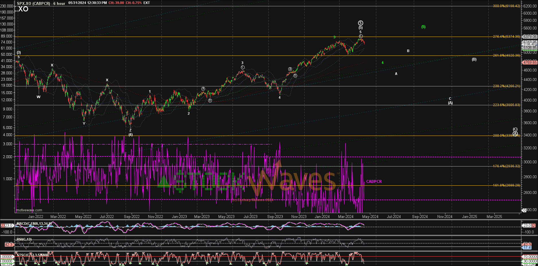 RTY is still not only divergent in that it looks clearly like a top to a (B) wave at a significantly lower high in April, but also clearly held a lower high again in May and seems to be trying to follow-through in a possible Leading Diagonal for wave 1 of (C).