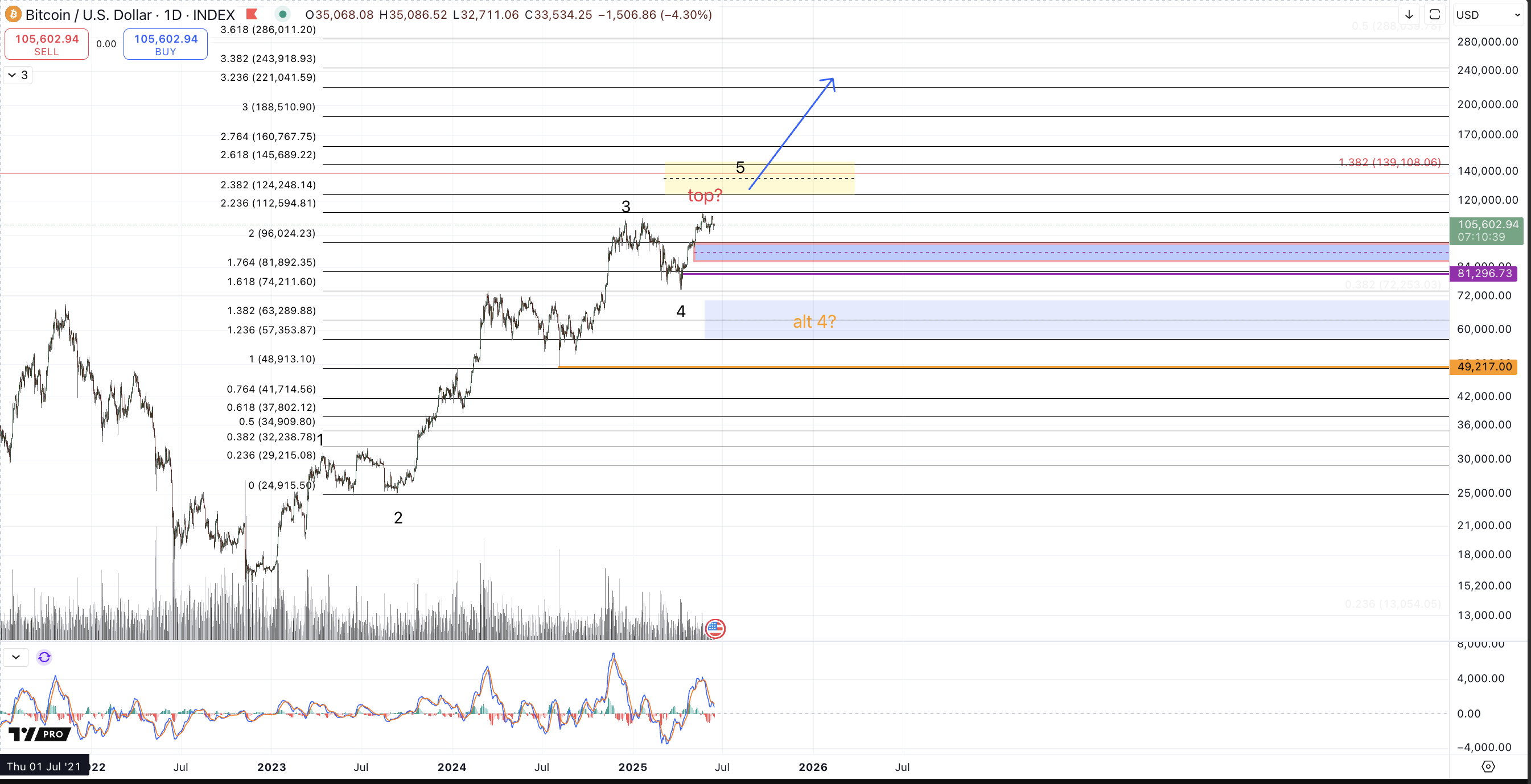 Should the upcoming week bring price down into the noted zone, $87k-$96k, this pull back can be viewed tentatively as an opportunity to accumulate more longs for the next run into new all-time highs targeting minimally $125k. Please note that my bigger bullish perspective that was outlined in the 6/4 article in blue count entails a very bullish move from the $87k-$96k given the potential circle i-ii interpretation from the April low now shown in black to indicate its primary status. "Support for this perspective is $87k-$96k and a successful test of this region could launch Bitcoin much higher, into $250k+ for a big 5th wave to complete the cycle from 2022." However, there are a few reasonable variations of my wave count interpretation from the August 2024 and April 2025 lows that strike confluence around the long term $125k-$140k target. Assuming a successful test of support in the coming week followed by new all-time highs, we can closely follow "must-hold" support levels to retain the more bullish and favored prospect of BTC attaining $200k+ in this cycle but at a minimum, a successful test of support should likely propel price up to $125k-$140k.