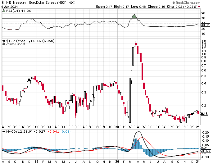 Meanwhile, the Treasury/Eurodollar spread remains low, indicating minimal offshore USD tightness: