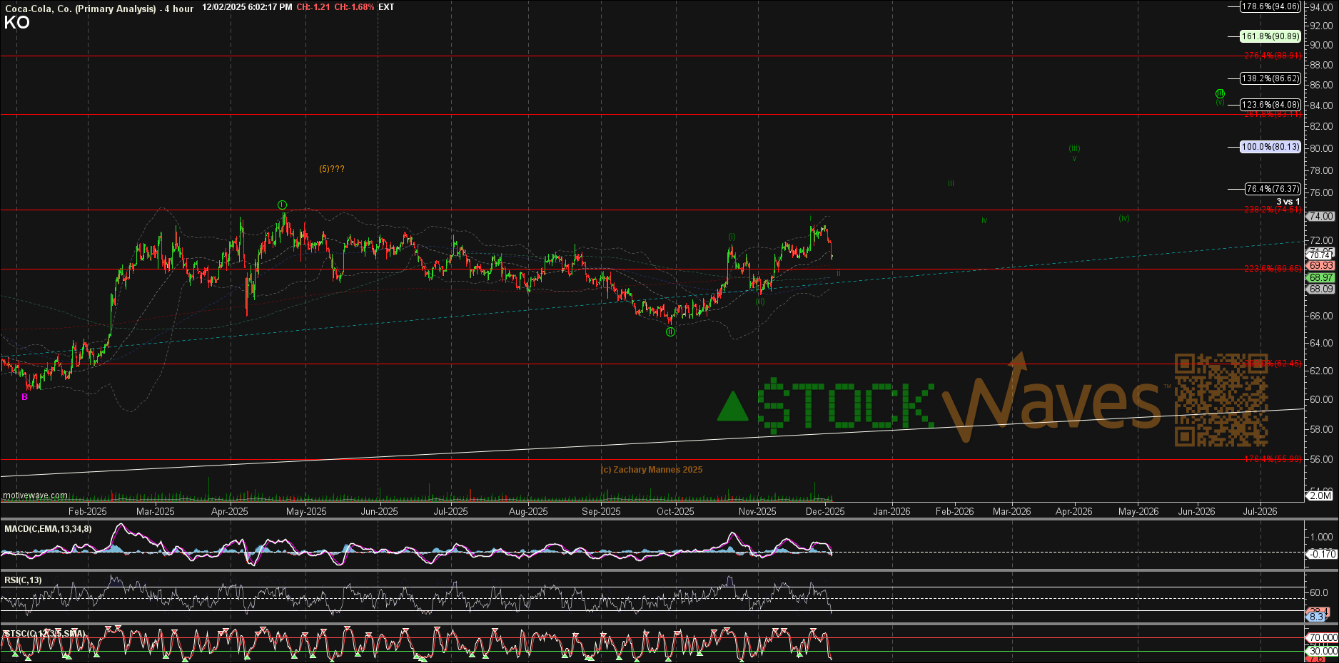 Our working view is that KO found a key low back in January. Zac’s chart shows a likely circle ‘i’–‘ii’ already in place, and potentially a nested (i)–(ii), i–ii setup forming. That allows us to define risk tightly at the wave (ii) low near $65.