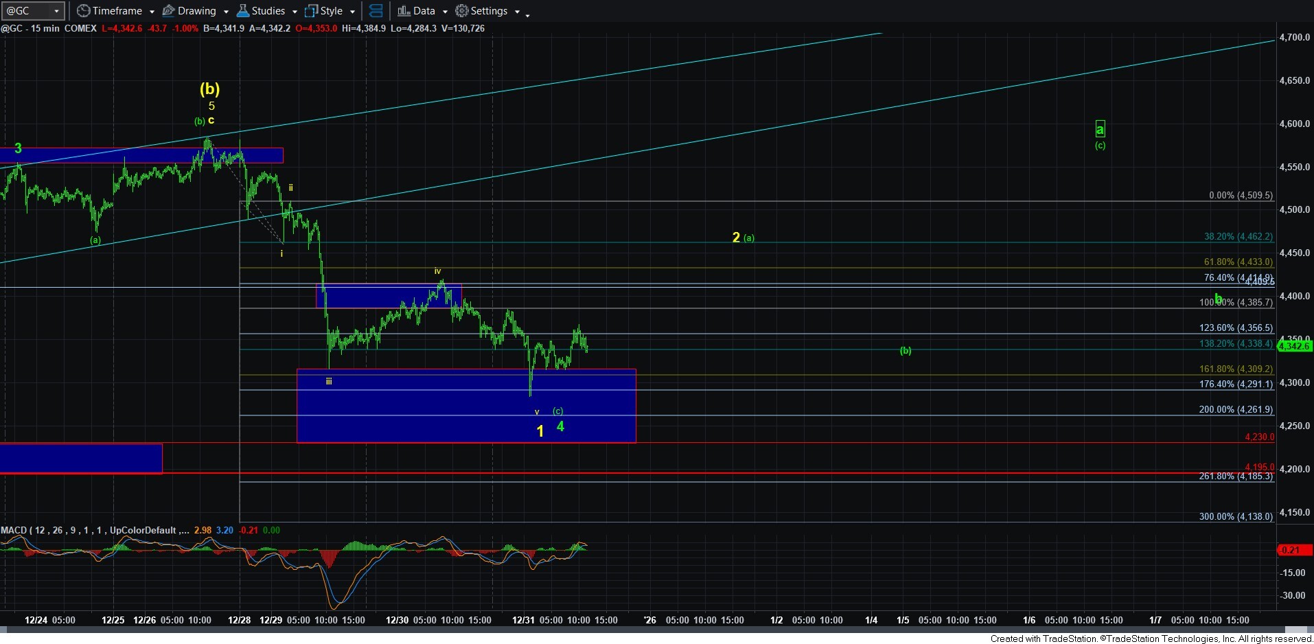 As far as gold is concerned, this still looks like a 4th wave in gold, as my primary count. Please take note of the adjusted wave count in green on the 15-minute chart to see how this would apply to the current 5-wave decline. Yet, with this 5-wave decline, it does add a new wrinkle to the gold chart, as there is a higher probability now that we could get that (c) wave decline towards the 3800-4000 region.