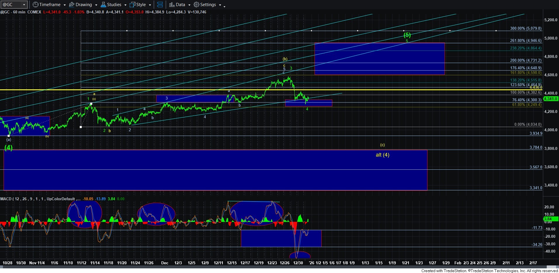 As I also explained in depth in the live video today, the nature of the next bounce in gold will likely be the same for the (a) wave in green as the wave 2 in yellow, since 2nd waves are corrective a-b-c structures, and a-waves are also most commonly a-b-c structures. Therefore, the only way to distinguish between the two will be the nature of the decline after the a-b-c rally completes. Is that decline is impulsive, and we then take out the low we create in this decline, then the yellow count will likely be applicable and pointing us towards the 3800-4000 region. And, of course, if the decline is corrective, then it likely points us towards the box overhead on the 60-minute GC chart.