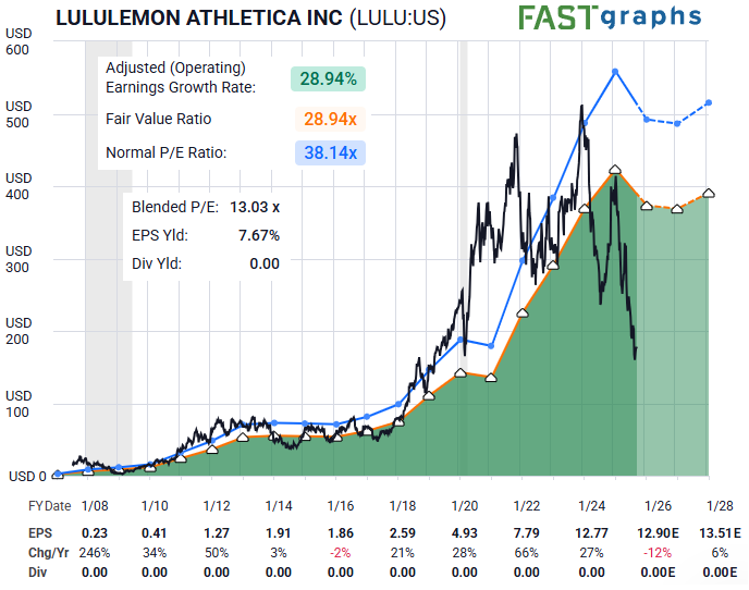 Just a brief glance at the LULU F.A.S.T. graph quickly confirms that shares have not seen this valuation level for some time. However, as Lyn so astutely cautions, there is the scenario where shares journey a continual spiral down as the stock reaches even cheaper than before.