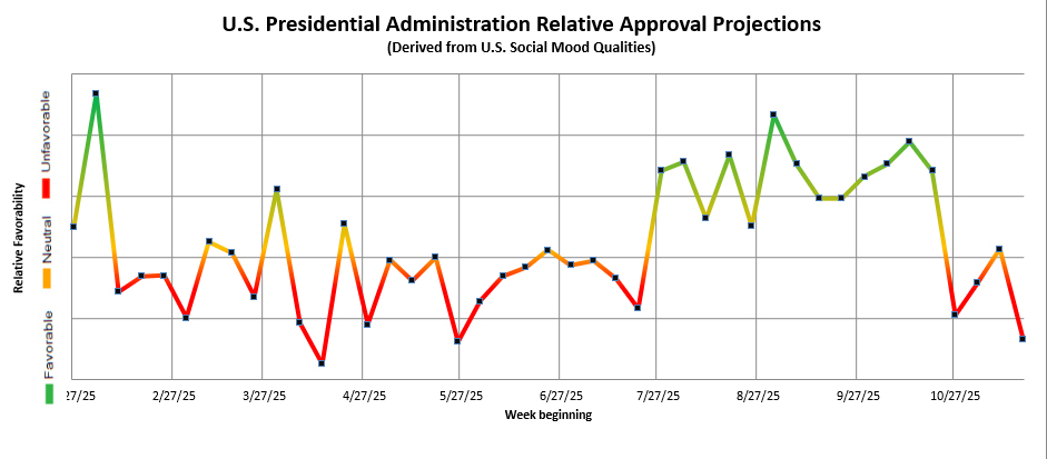 The Presidential Favorability chart (below) shows the relative favorability (relative vs. opposition). It appears to be dropping drastically this week from a peak last week. With trade signals a week behind that, Prez Trade Systems 1 &2 went short early (and the long trade closed) when the low of the week was breached on Thursday with a posted gain of 417 SPX points on this hypothetical trade. System 3 will go short at close on Friday (today) for two weeks. Systems 1&2 hypothetical trades are currently up about 9 SPX points from entry on 10/30/25. They are staying short (System 2 planned exit is in two weeks).