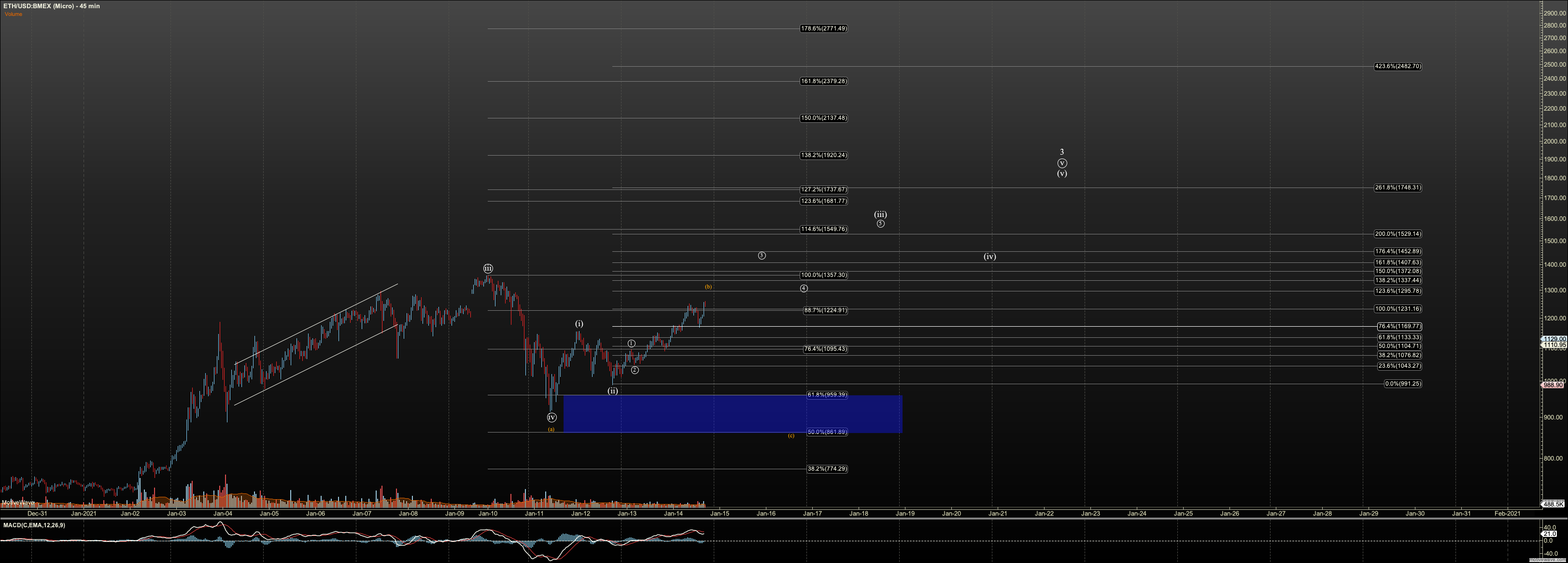 Ether now crossed the .764 extension. This means we can use $1115 for the pivot between the continued march to $1560 and a C wave back to $850.
