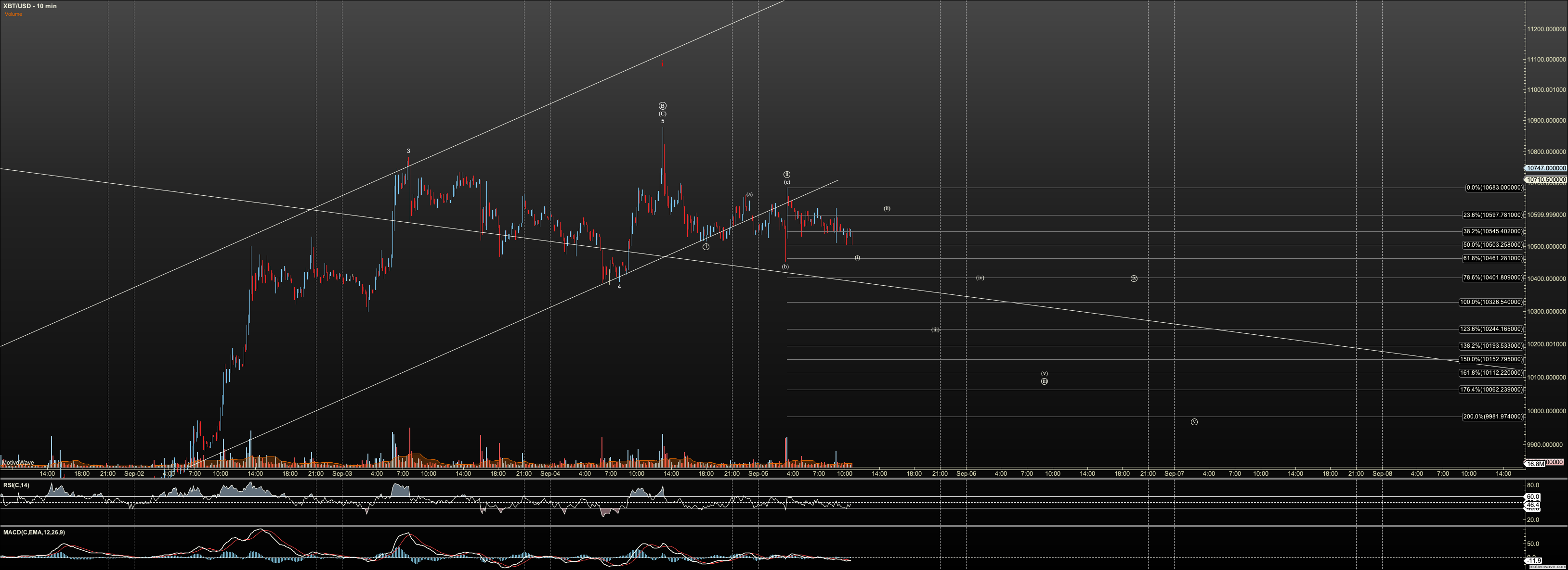 1. Bitcoin has not confirmed that the higher B has topped though it has given warning. I have a nano projection to $9980. If we see follow through, then I’ll consider it likely the B wave has topped.