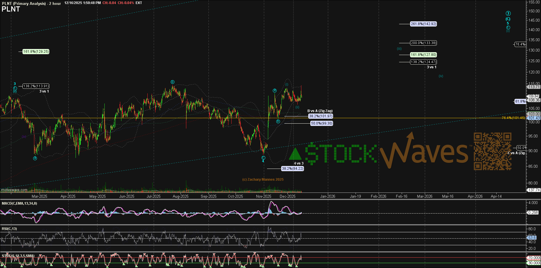 As a brief recap, Zac is tracking PLNT as nearing completion of a wave (v) of a circle ‘c’ within wave 5 of a larger (C) wave, all nested inside an even greater-degree Primary Wave 3. It’s a mouthful, but the takeaway is straightforward: we are at a moment where risk can be defined cleanly and upside can be framed objectively.