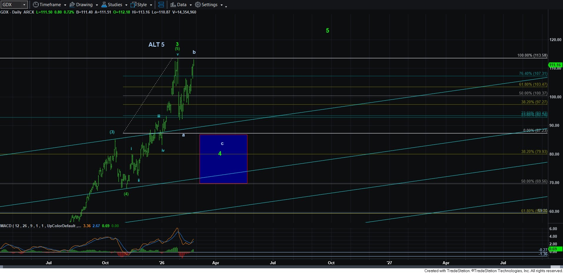 “Because of how high this b-wave has pushed in GDX, I have to now consider the potential of a 4th wave flat, which why I had to move support up. My preference still remains a return to the 80 region for now. WE will have to see how the 3rd wave in the c-wave projects to have a better idea. Clearly, the more the 3rd wave down takes us, the more likely the 80 region will be.”