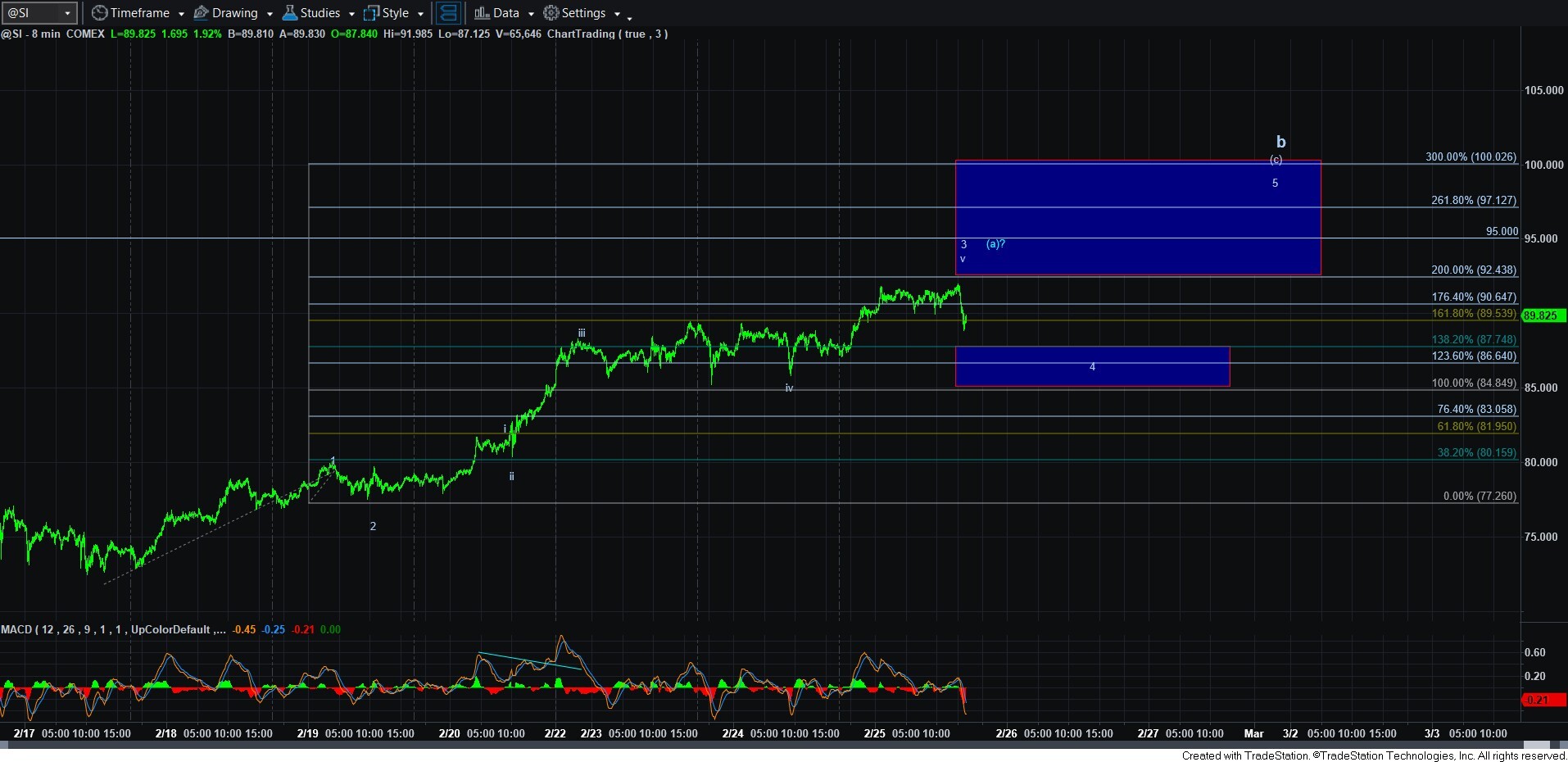 So, at this time, with silver seemingly completing wave 3 of this rally, I have to assume the pullback for wave 4 began towards the end of the trading session. And, as long as we hold over 84.85, we can reasonably expect one more higher high.