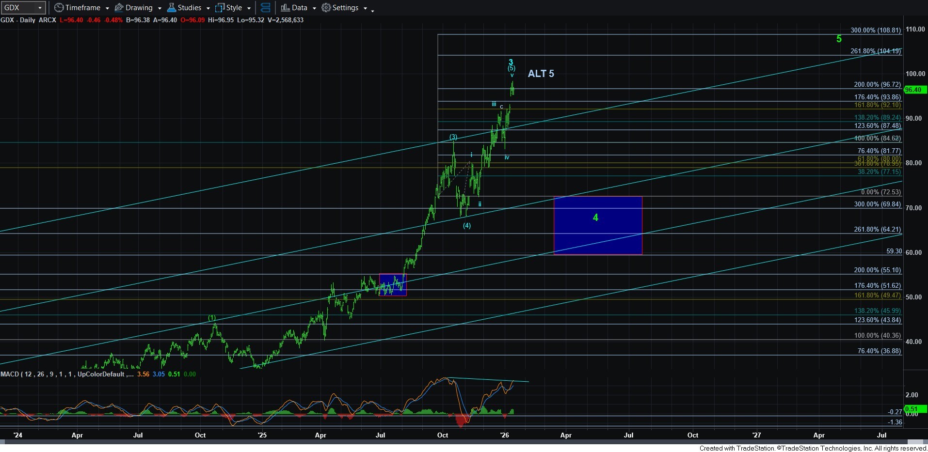 And, of course, we can say the same of GDX. And, a break down below 88 places us squarely in wave 4.