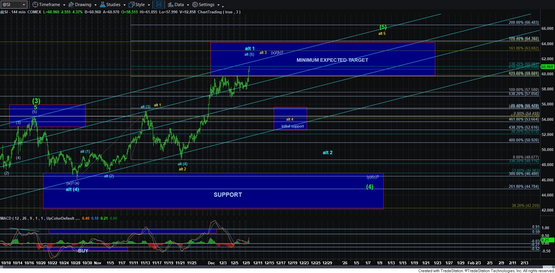 While silver is pushing into the minimum expected target region we set a while ago, I cannot say that this changes much in the analysis. I am still uncertain as to which of the paths silver is going to take higher, as this is just a 5th wave in all the potential paths I have posted. And, yes, I still expect a pullback. But, as the analysis presented over the last week noted, I am still not sure how deep that pullback will be. And, based upon the depth of the pullback, we will have a much better idea as to how high silver can travel in its larger 5th wave.