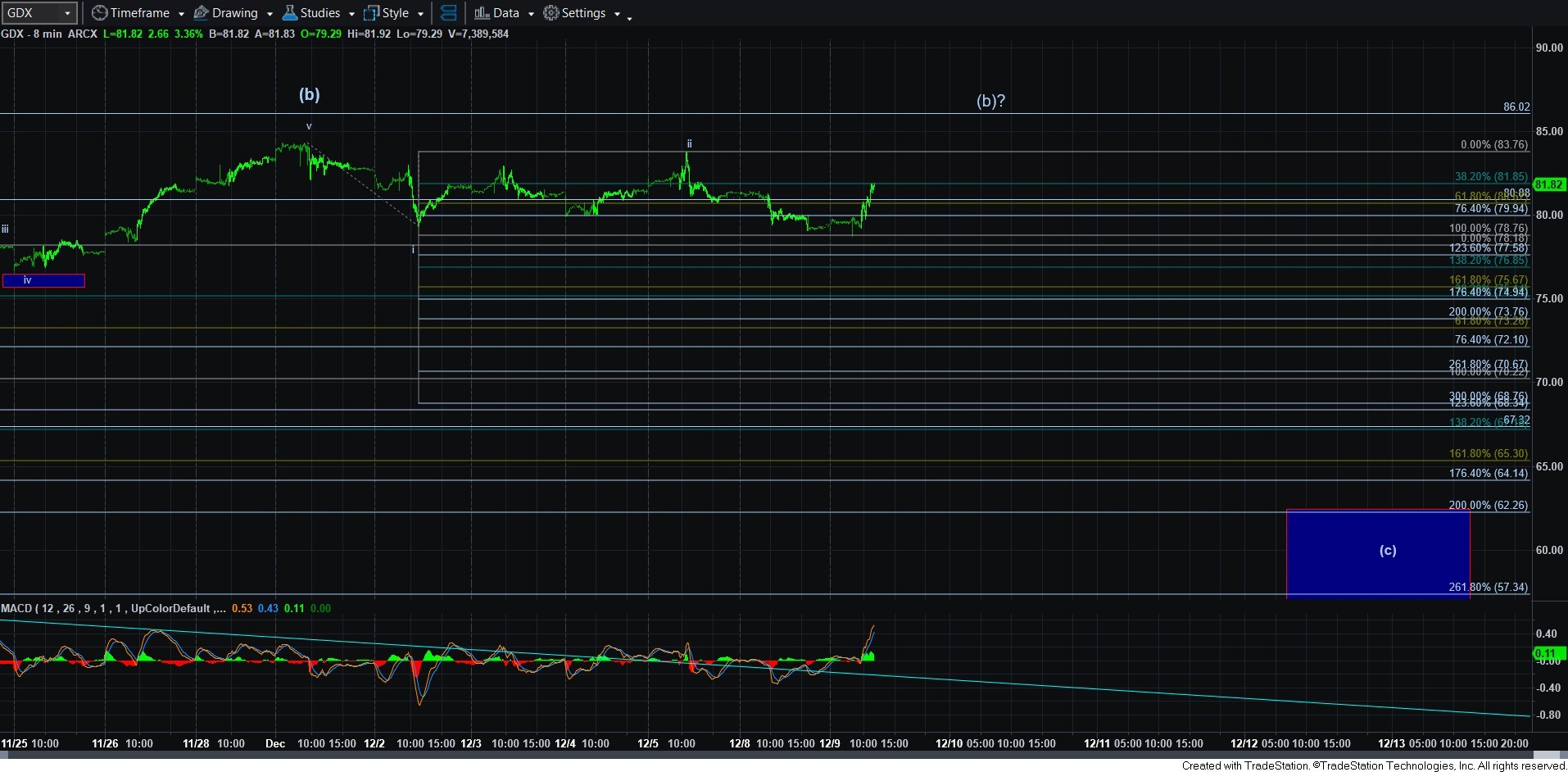 Interestingly, both GDX and gold still maintain below the recent highs. But, there is still a reasonable interpretation that can push GDX back to the 86 region unless we see a clearly impulsive break down below yesterday’s low. There is still also a reasonable interpretation that can push gold into its resistance box for the alt 5 as well, until we see a clearly impulsive break down below yesterday’s low as well.
