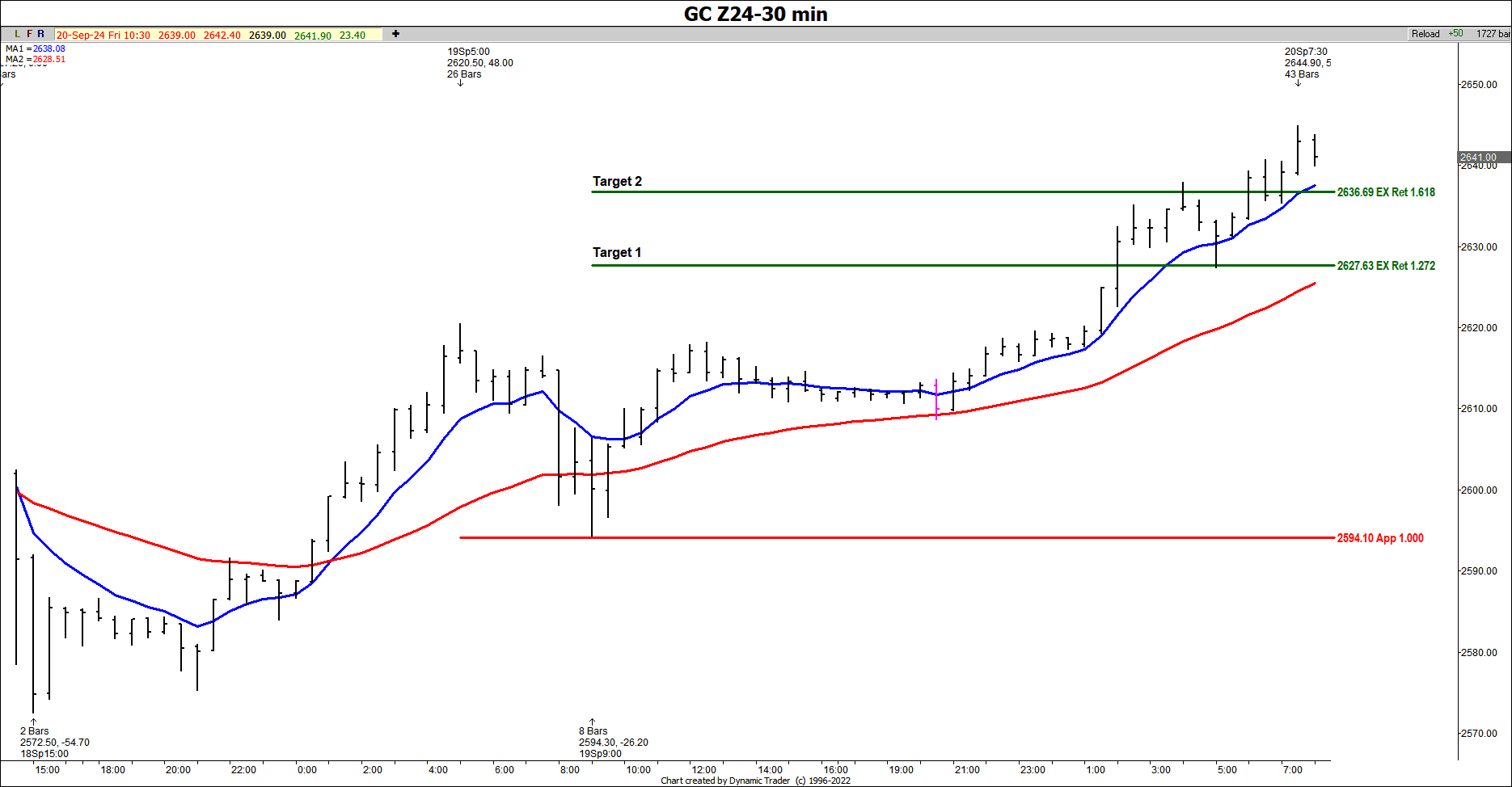 We noted a bullish setup this week on the 30-min GC chart.  Both targets were met for a rally of 50.6 points.