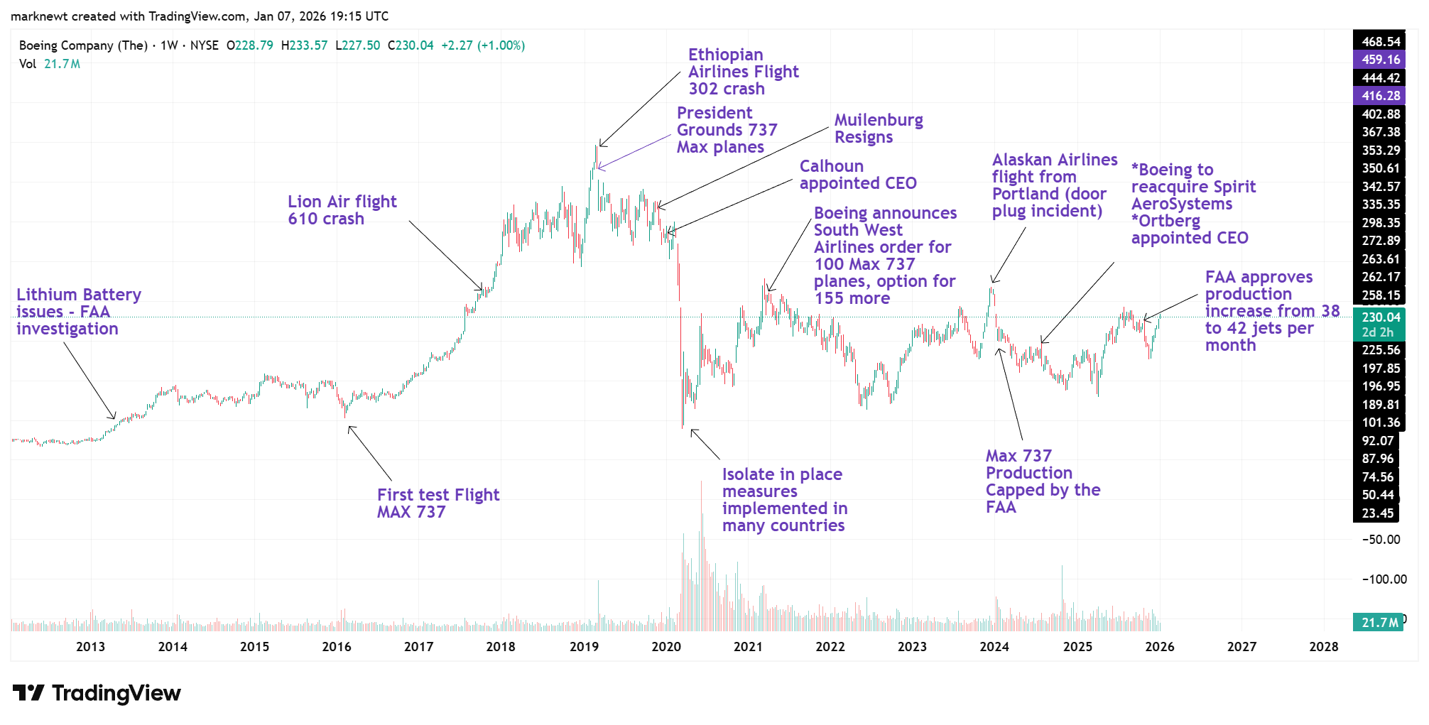 Saying that Boeing has been in the news over the last decade for all the wrong reasons is a big understatement. If one was looking at the stock in a vacuum it might appear that stock price has tracked both the ascent and decline of the Max 737 airplanes since 2015. However, if I asked individuals to place these moments on the chart, I think many would be hard pressed to do so.