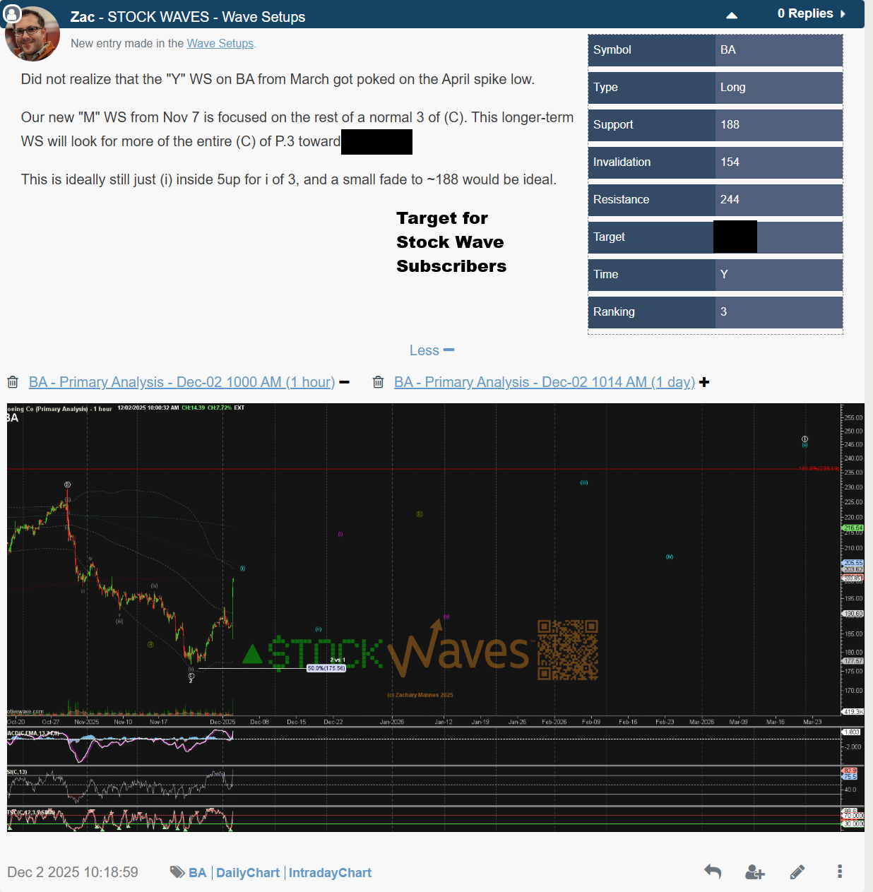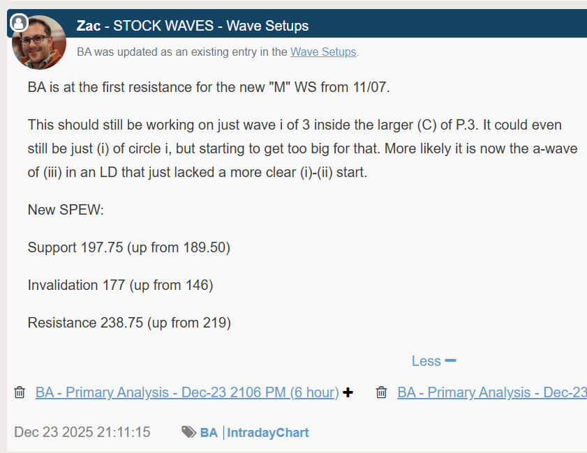 Zac has since provided a formal WS update on December 23rd for the Months setup, as price pushed over the initial resistance level and increased support and invalidation levels and included BA in multiple intraday updates and end of day videos.