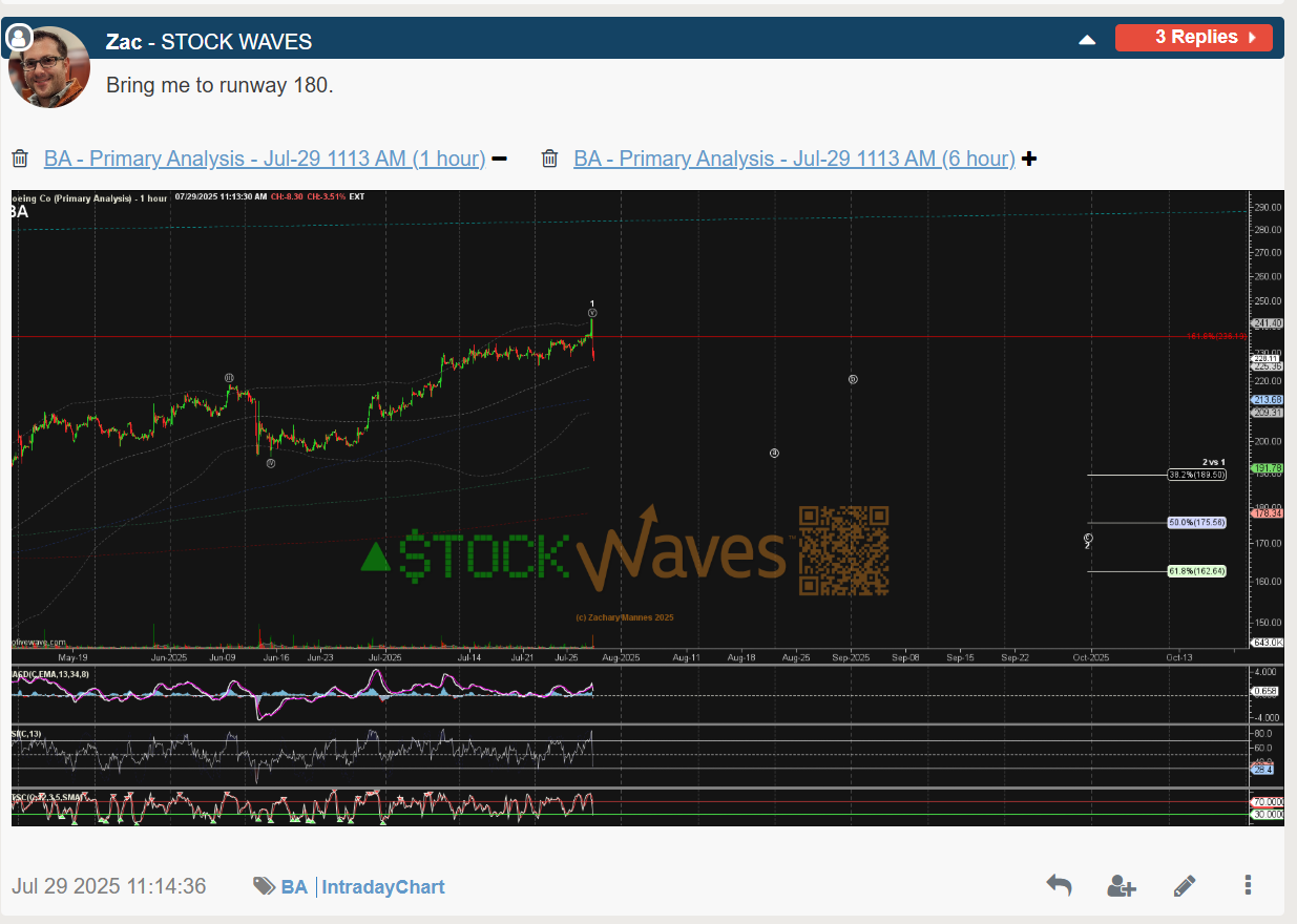 Zac’s July analysis proved to be spot on as price bottomed at 176.79 on Nov 21st, but back on November 18th, he highlighted BA again on Charts of the Day video for subscribers, saying he sees room for lower, but that a move directly lower favored a bottom being attempted for 2 vs just a bounce attempt in yellow circle b.