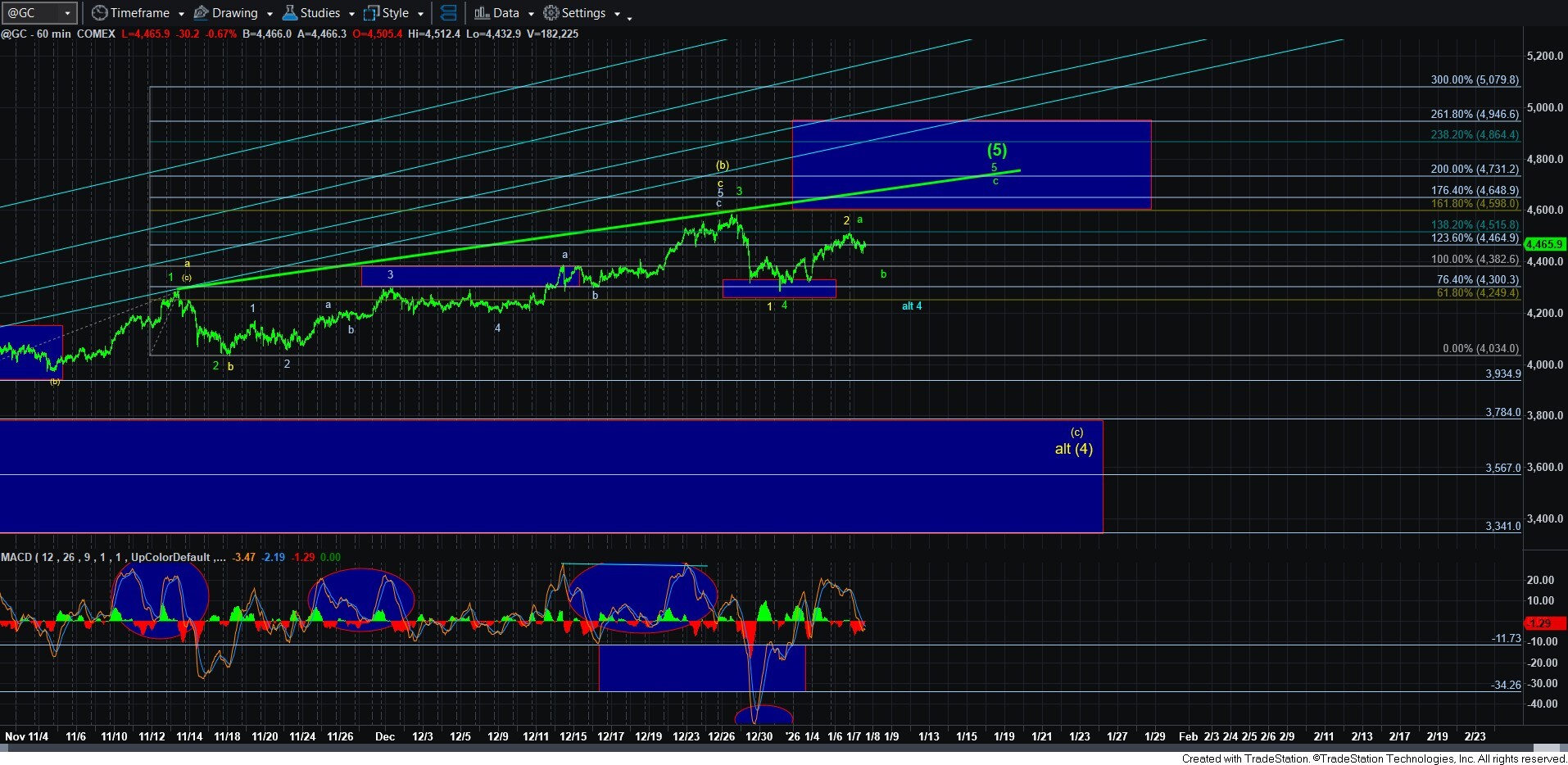 As far as the alternatives to the b-wave count, I have added a blue count which is akin to the yellow counts in both GDX and silver, which would suggest we have only begun a bigger (a)(b)(c) pullback in wave 4 in gold. Note that we have come up high enough now in gold to allow for a (c) wave decline and still be in the wave 4 in the diagonal, which would likely target the 4200-4280 region should we see a full (c) wave decline. But, as I said, this is going to have to be an alternative right now since I cannot say the decline is CLEARLY a 5-wave structure.