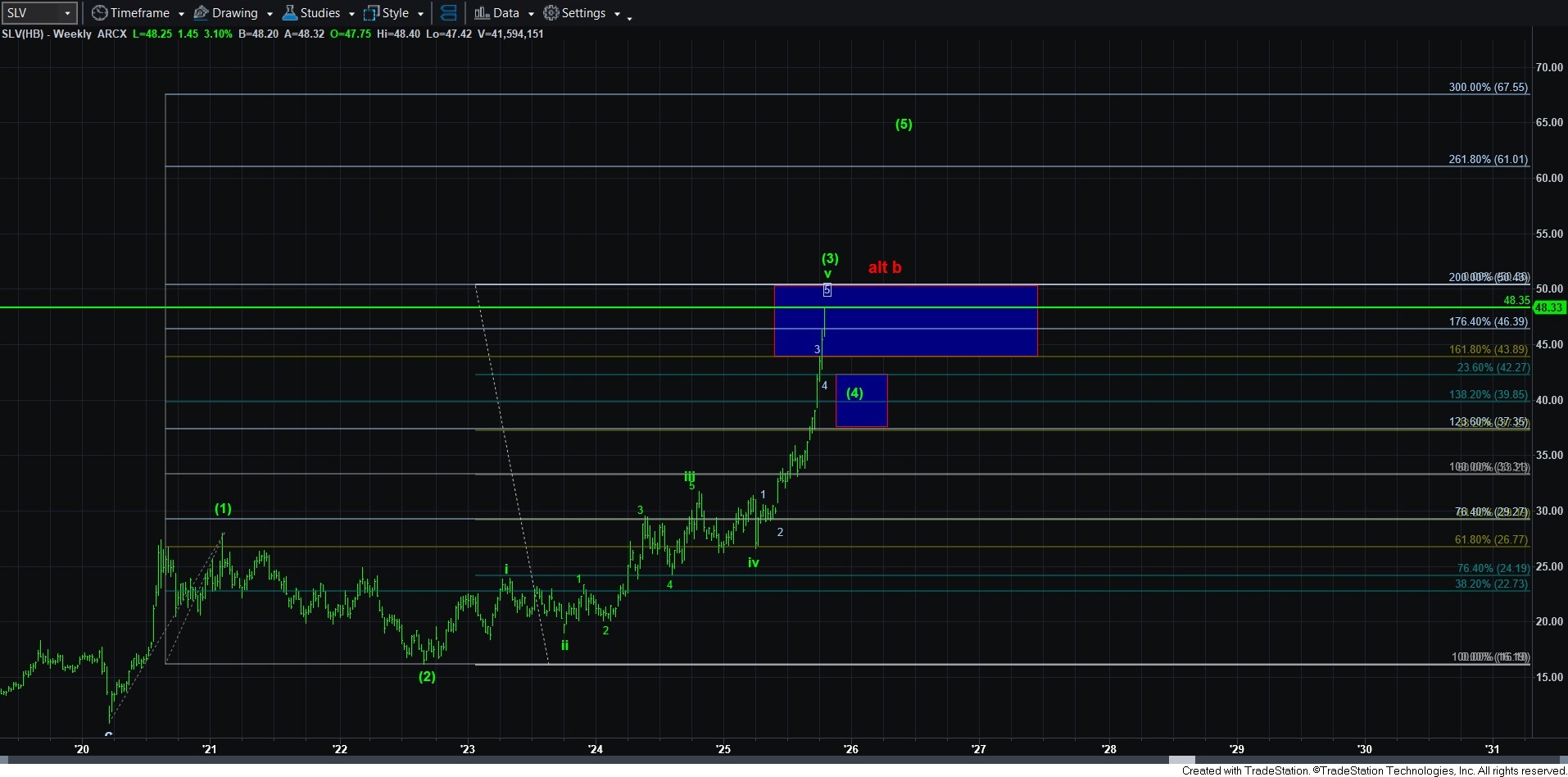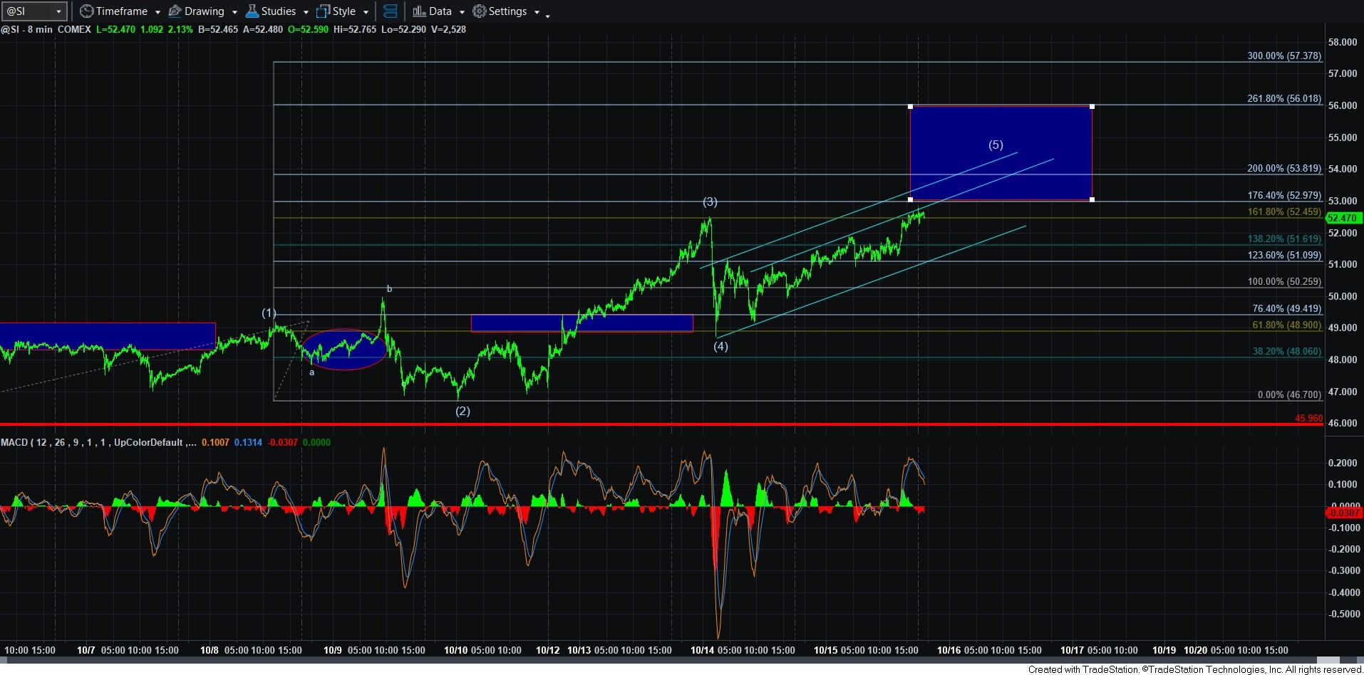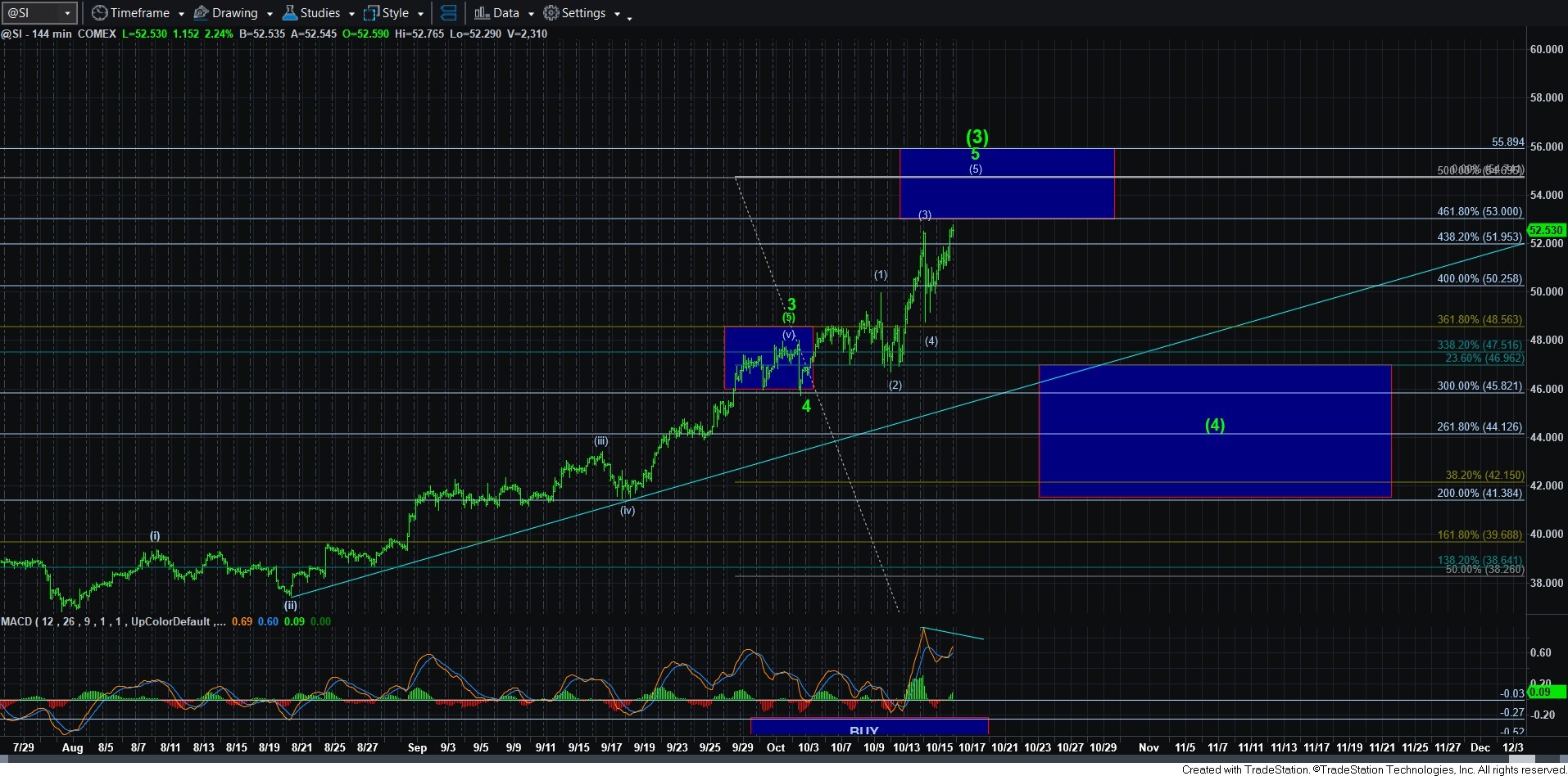 Yet, this structure has me assuming that we can still push a bit higher towards the 53-56 region to complete wave 5 of (3), followed by what will likely be a multi-week pullback in wave (4). And, I have placed a general target for wave (4) based upon a .236-382 estimated retracement of wave (3) expectation for that wave (4).